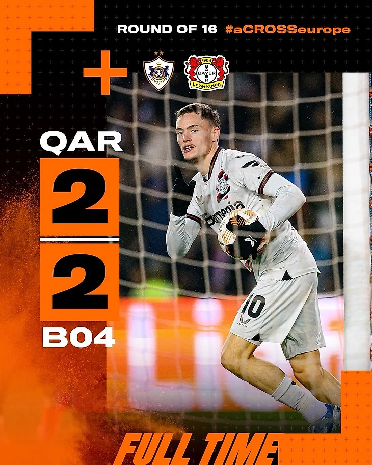 Сложный первый тайм, но отличный боевой дух до конца и заслуженная награда: «Байер 04» заработал ничью со счётом 2:2 в первом матче 1/8 финала Лиги Европы УЕФА с «Карабахом».