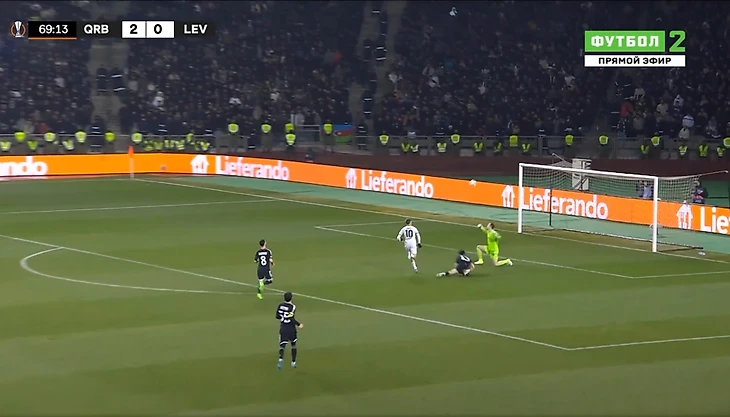 Результат пришёл на 70-й минуте: на этот раз экс-вратарь «Байера 04» Андрей Лунев сделал неудачный пас в штрафную «Карабаха» - Вирц воспользовался этим и забил гол, перебросив вратаря и сделал счет 1:2.