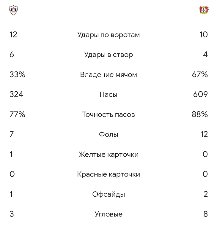 2) Подавлящее количество ударов по воротам и в створ (9 ударов по воротам и 4 в створ) у Карабаха и 2 удара по воротам и 1 в створ у Леверкузена.