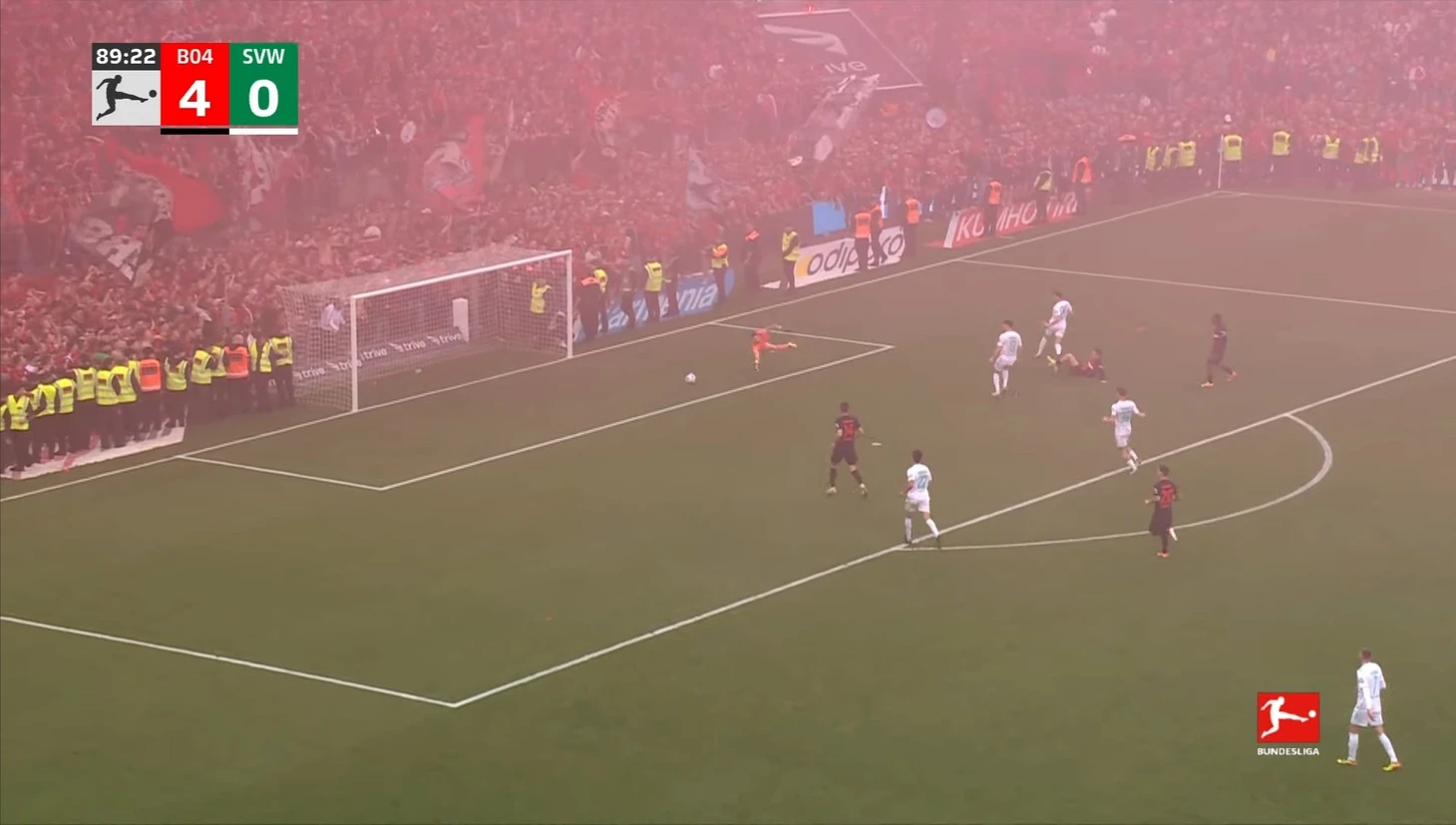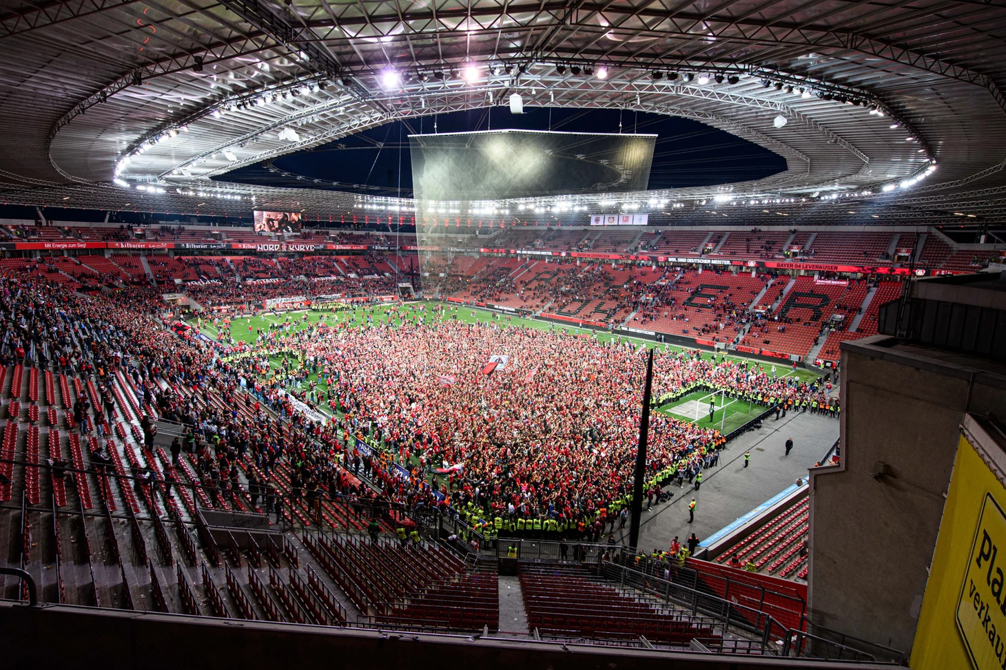 Это уже было не остановить! Через несколько секунд после того, как Флориан Виртц сделал счет 5:0, толпа выбегала со всех сторон на поле, и рефери не стал мешать празднику. Аккуратно отошёл к бровке, немного подождал и ровно на 90-й минуте дал свисток об окончании матча. Между игроками и болельщиками происходили эмоциональные моменты, которые, несомненно, будут длиться вечно и навсегда войдут в историю немецкого футбола. Слезы радости текут рекой, объятия теплые и крики радости пылкие.