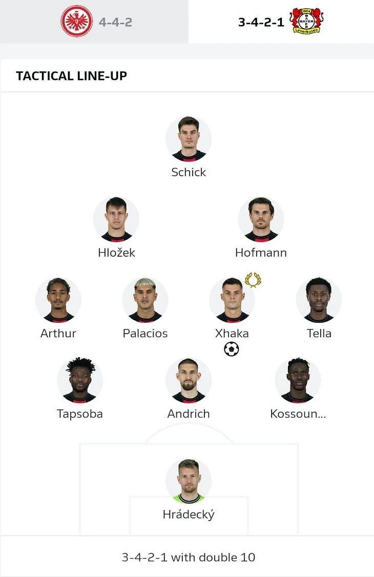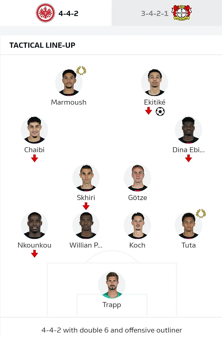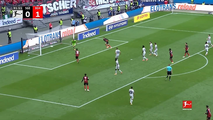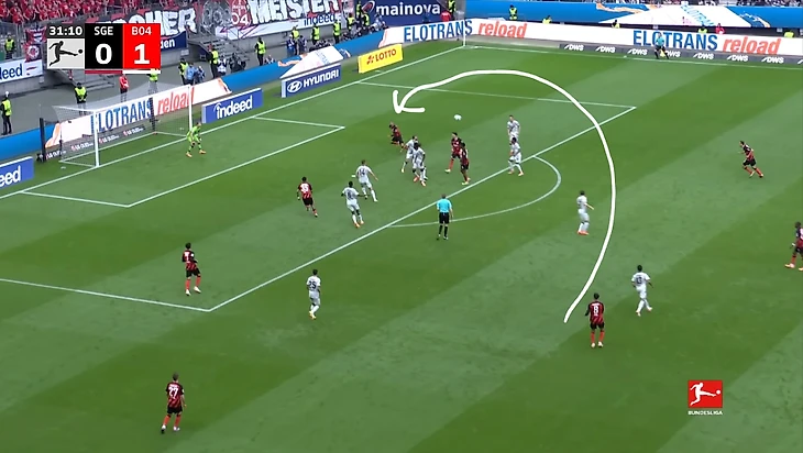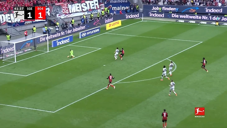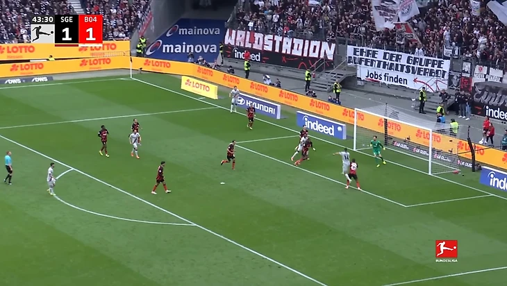 Почти из ниоткуда пришёл гол «Айнтрахта» после углового, когда счёт стал 1:1. Навес Фареса Шаиби нашёл Уго Экитике за линией защиты «Леверкузена», а затем нападающий ударом головой в дальний угол сравнял счёт в матче.