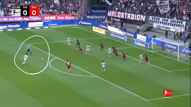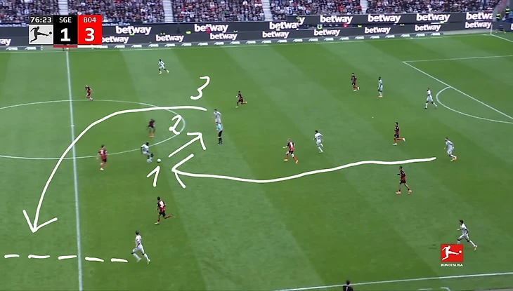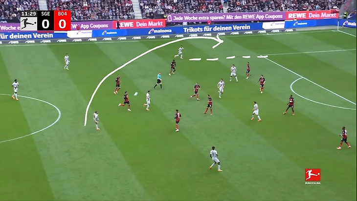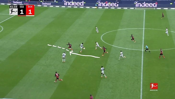 «Айнтрахт» пытался взломать оборону «Байера» короткими розыгрышами на фланге. Один из примеров такой атаки. Игроки «Айнтрахта» прессингуют «Байер», быстро отбирают мяч и отдают пас на Экитике, открывавшегося в полуфланге. Затем он выводит Дина Эбимбе на пространство для прострела, который игрок «Байера» заблокировал и выбил мяч на угловой.