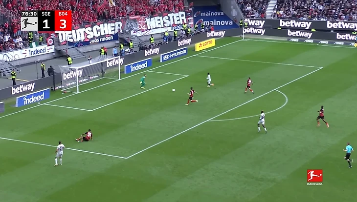 Третий пропущенный гол не оказал особого влияния на «Айнтрахт». Команда продолжила играть впереди и оказывала давление на леверкузенскую команду. «Байер» теперь в первую очередь ждал больше возможностей для контратаки. И с успехом: отобрав мяч, быстро прошли через четыре паса к воротам «Айнтрахта», где Фримпонг закмкнул прострел Гложека (у него хет-трик из ассистов).