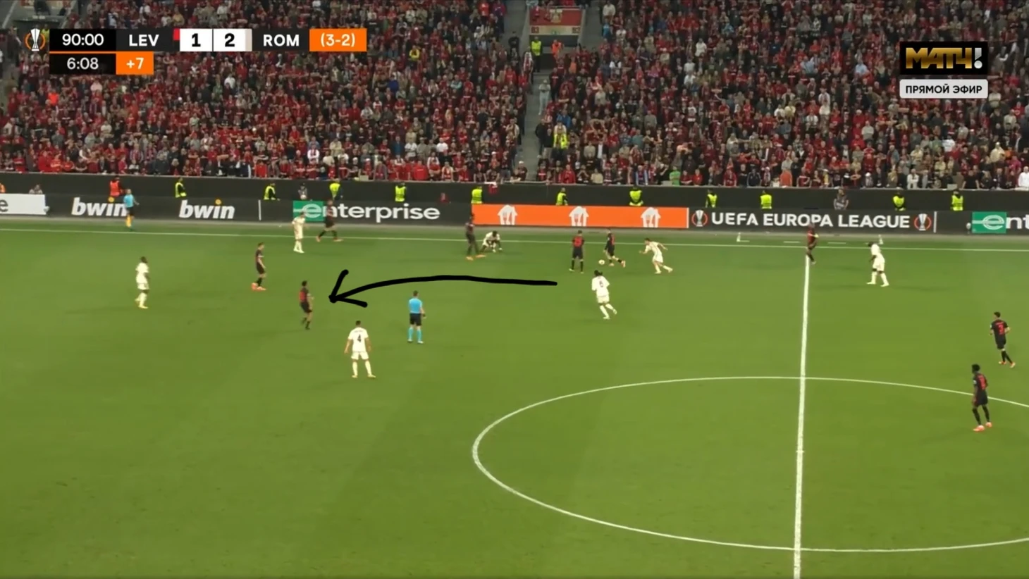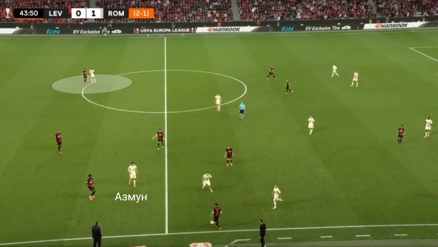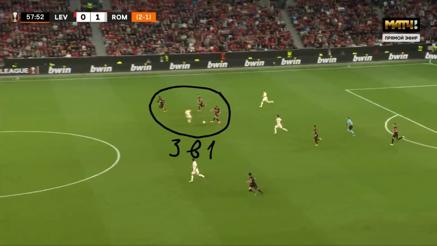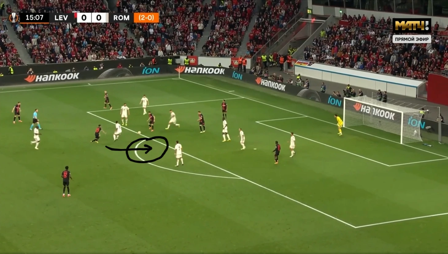 Мастеркласс выхода из-под прессинга от «Байера» был показан уже на 10-й минуте. По большей части в самом прессинге «Ромы» были дыры, которые существенно снижали его эффект. Команда Хаби Алонсо чаще всего убегала в опасные котратаки через центр поля. В этом моменте понадобилось всего лишь 3 передачи, чтобы запустить Гложека на огромное пространство вперёд к воротам соперника.