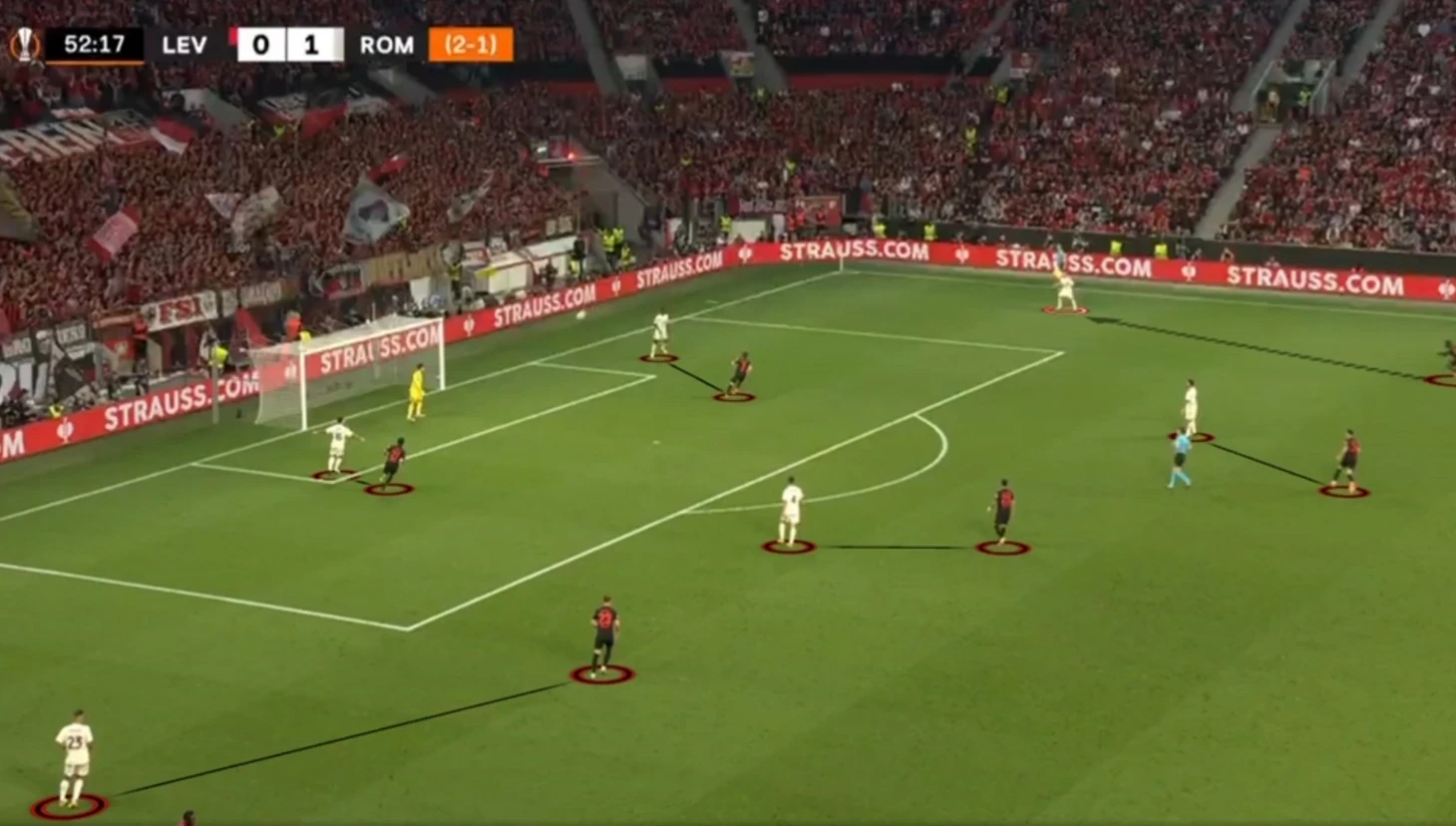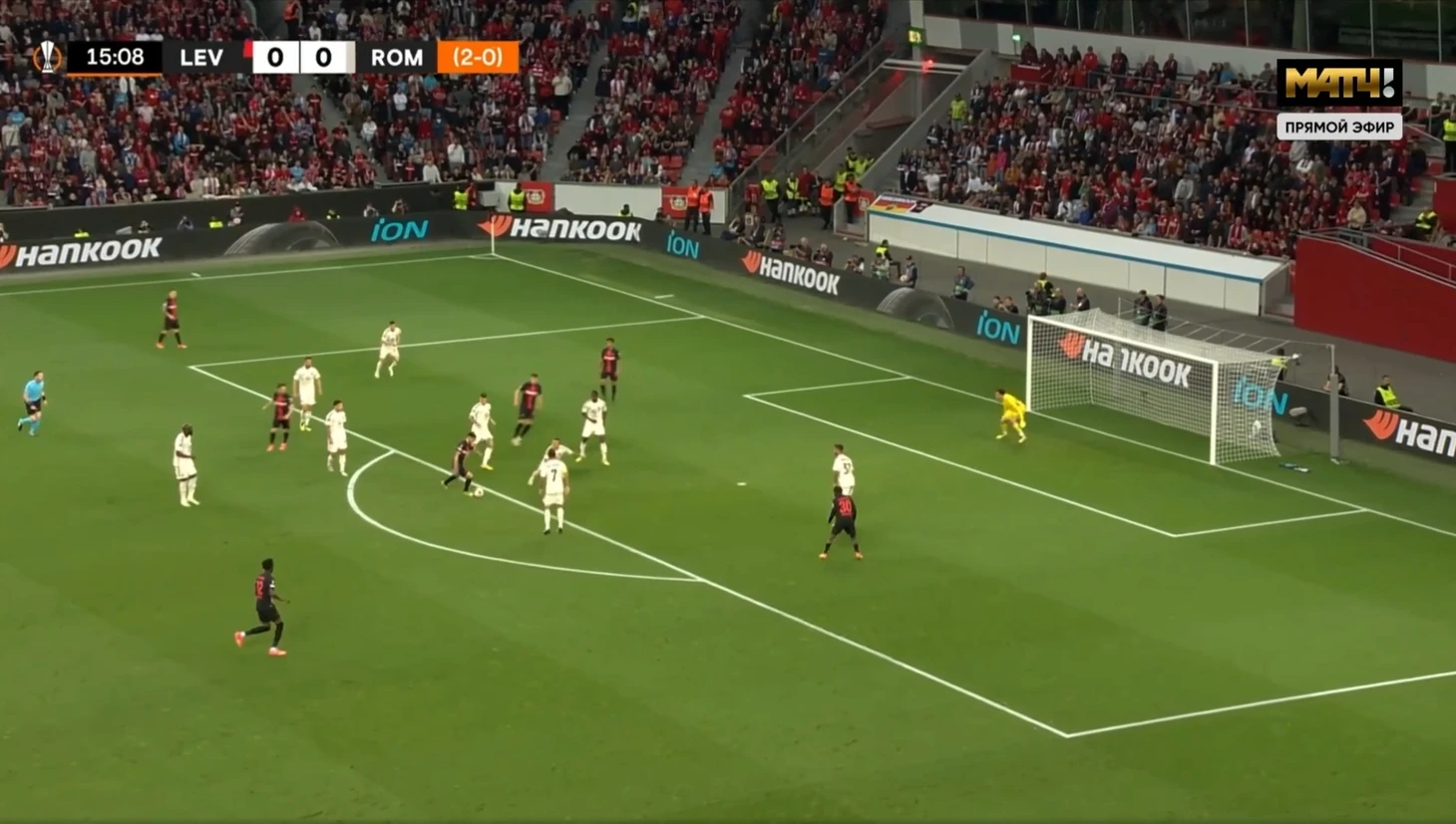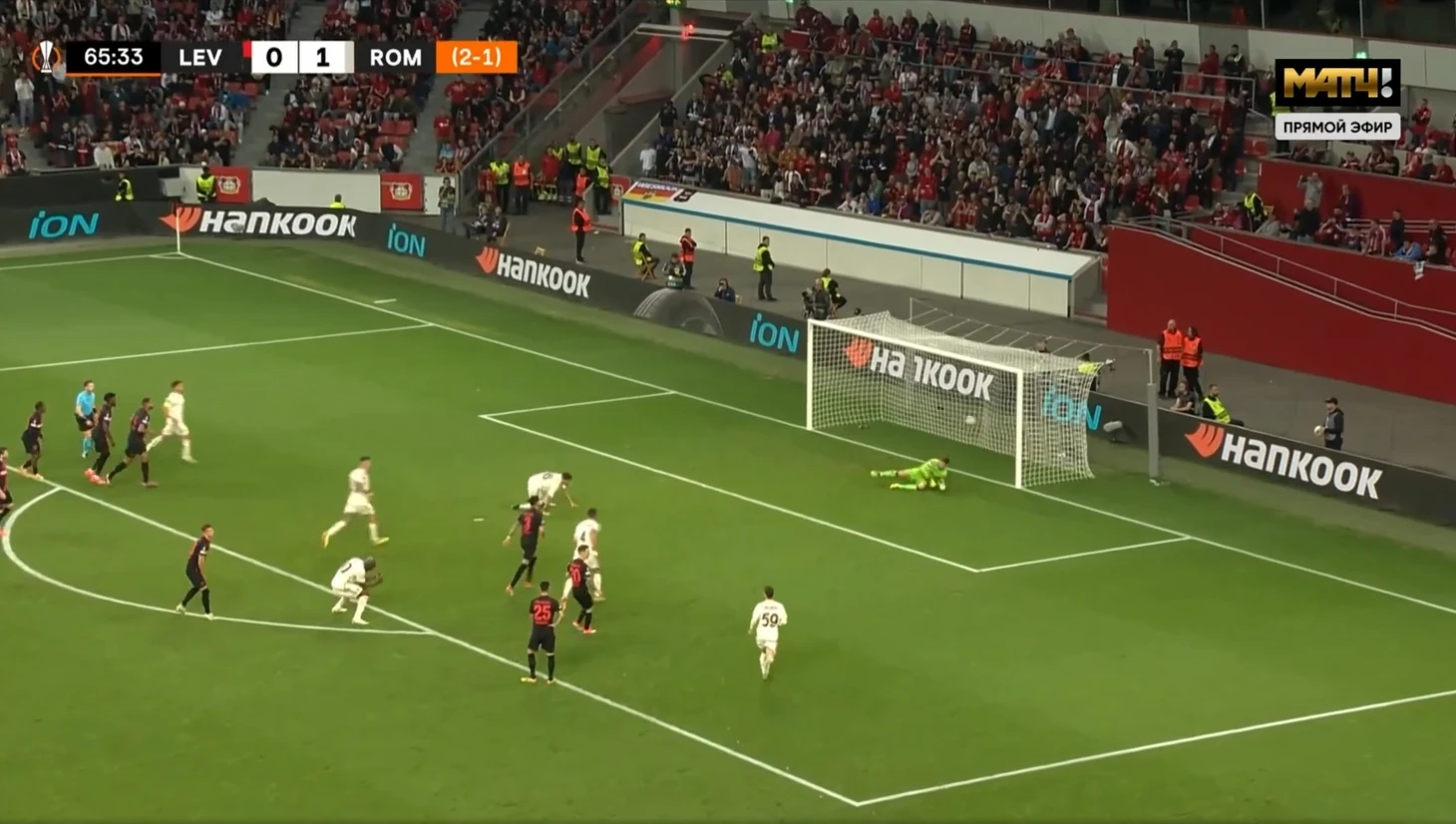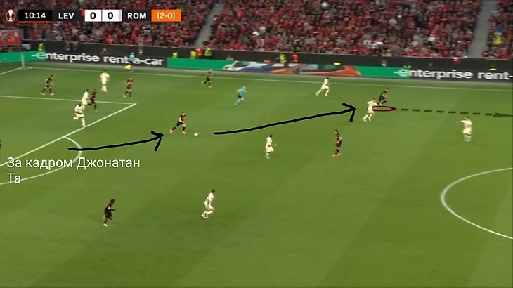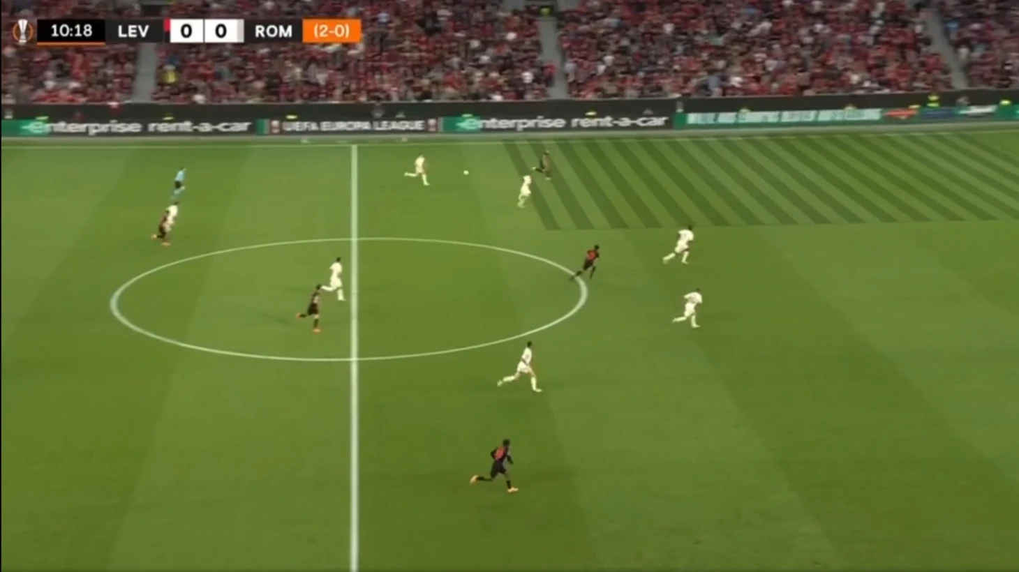 Мастеркласс выхода из-под прессинга от «Байера» был показан уже на 10-й минуте. По большей части в самом прессинге «Ромы» были дыры, которые существенно снижали его эффект. Команда Хаби Алонсо чаще всего убегала в опасные котратаки через центр поля. В этом моменте понадобилось всего лишь 3 передачи, чтобы запустить Гложека на огромное пространство вперёд к воротам соперника.
