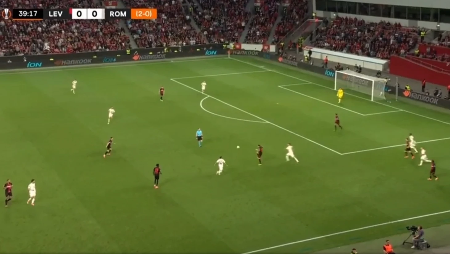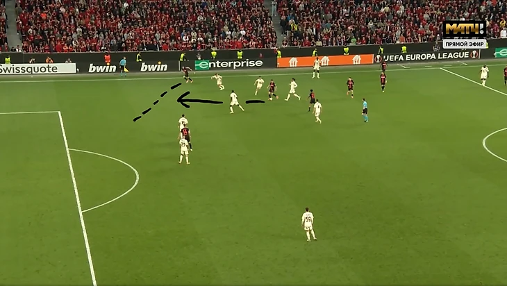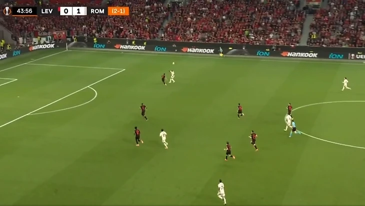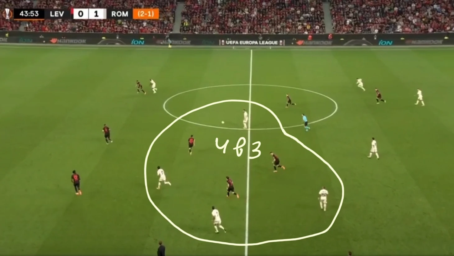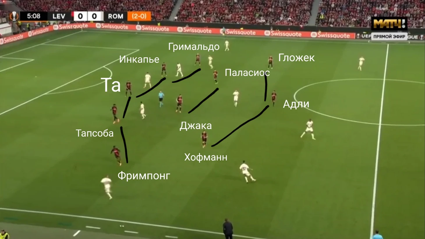 Мастеркласс выхода из-под прессинга от «Байера» был показан уже на 10-й минуте. По большей части в самом прессинге «Ромы» были дыры, которые существенно снижали его эффект. Команда Хаби Алонсо чаще всего убегала в опасные котратаки через центр поля. В этом моменте понадобилось всего лишь 3 передачи, чтобы запустить Гложека на огромное пространство вперёд к воротам соперника.