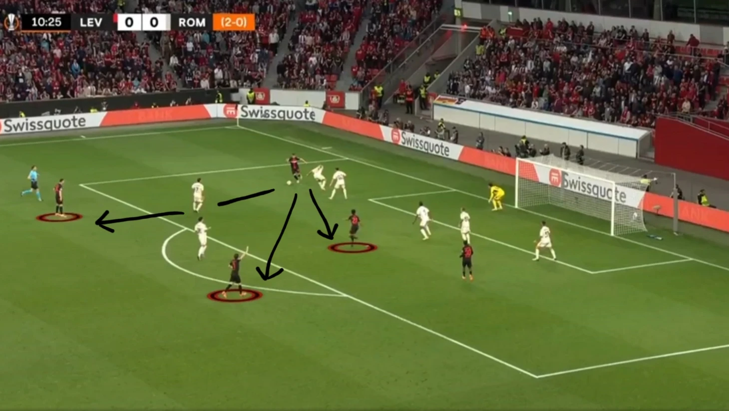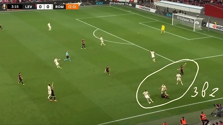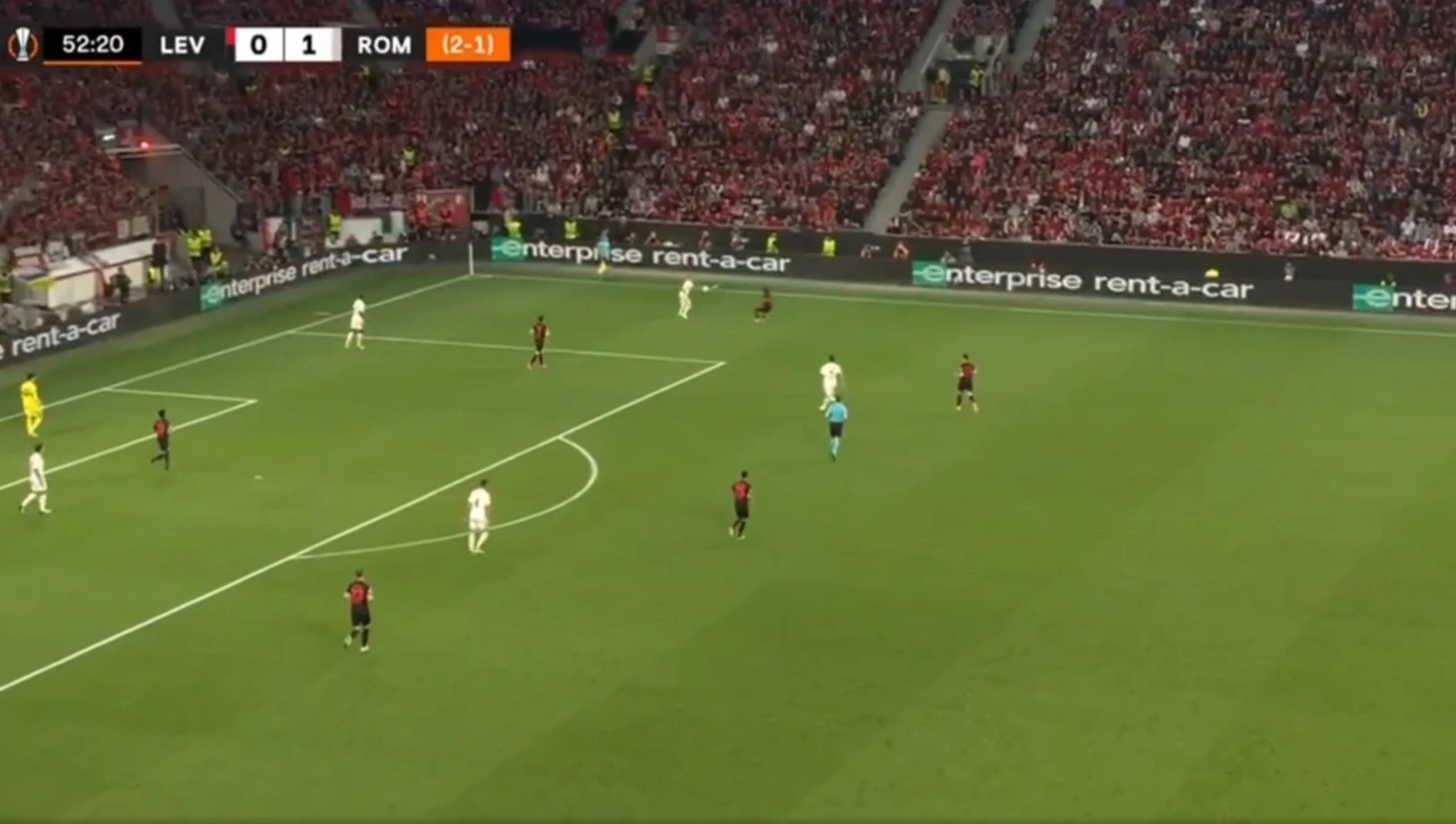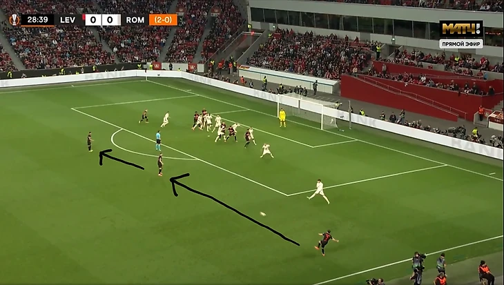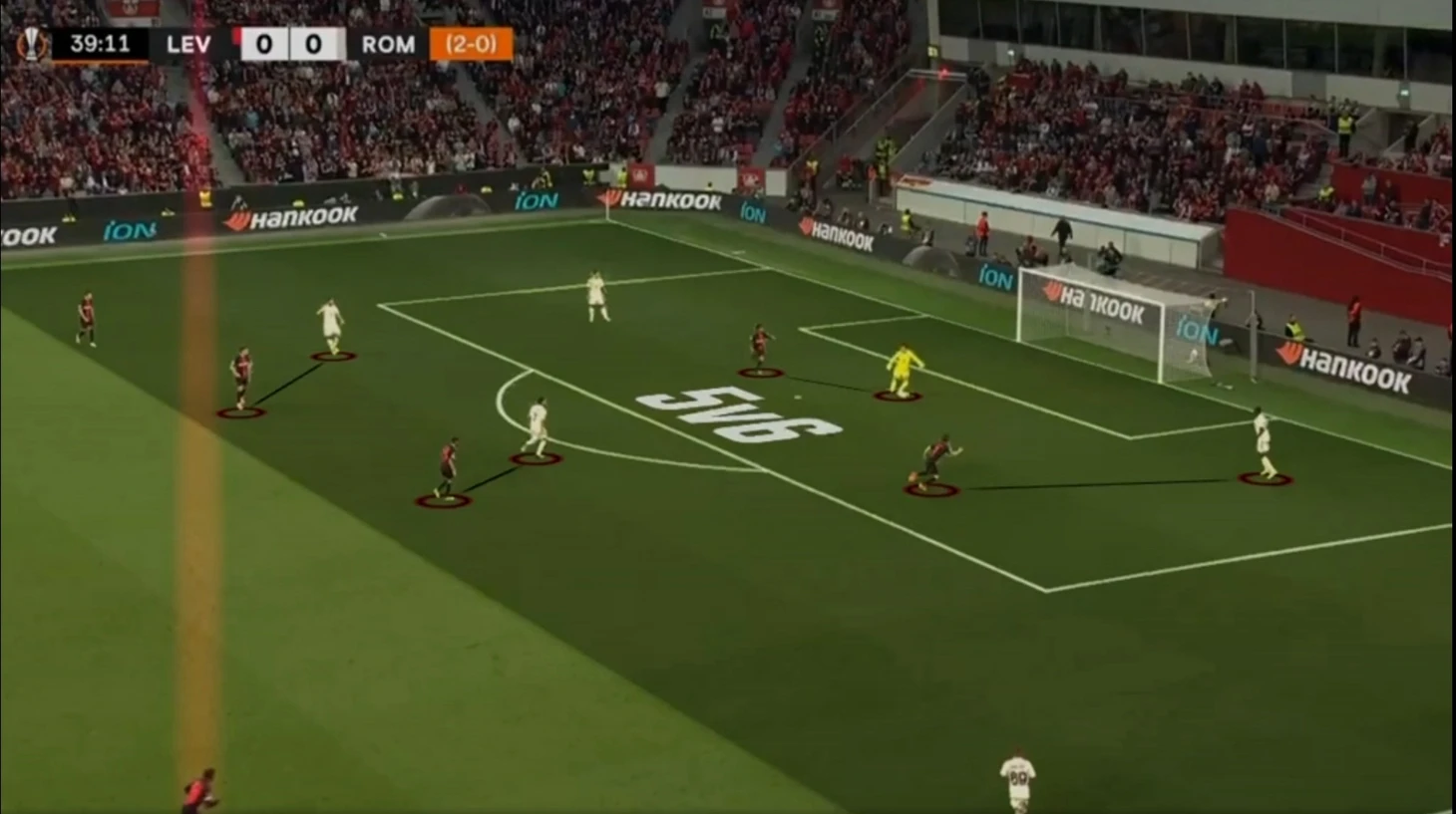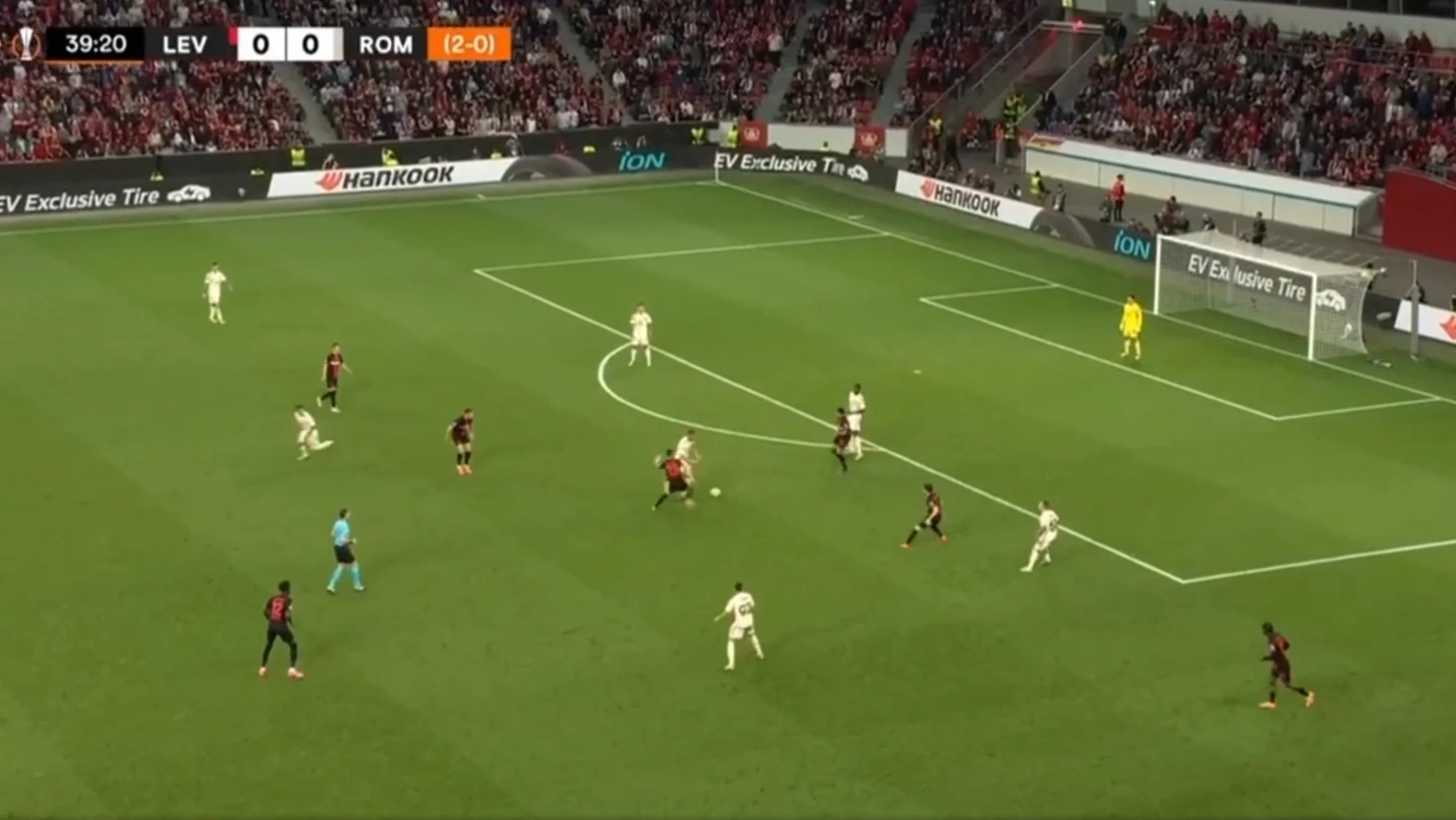 Мастеркласс выхода из-под прессинга от «Байера» был показан уже на 10-й минуте. По большей части в самом прессинге «Ромы» были дыры, которые существенно снижали его эффект. Команда Хаби Алонсо чаще всего убегала в опасные котратаки через центр поля. В этом моменте понадобилось всего лишь 3 передачи, чтобы запустить Гложека на огромное пространство вперёд к воротам соперника.