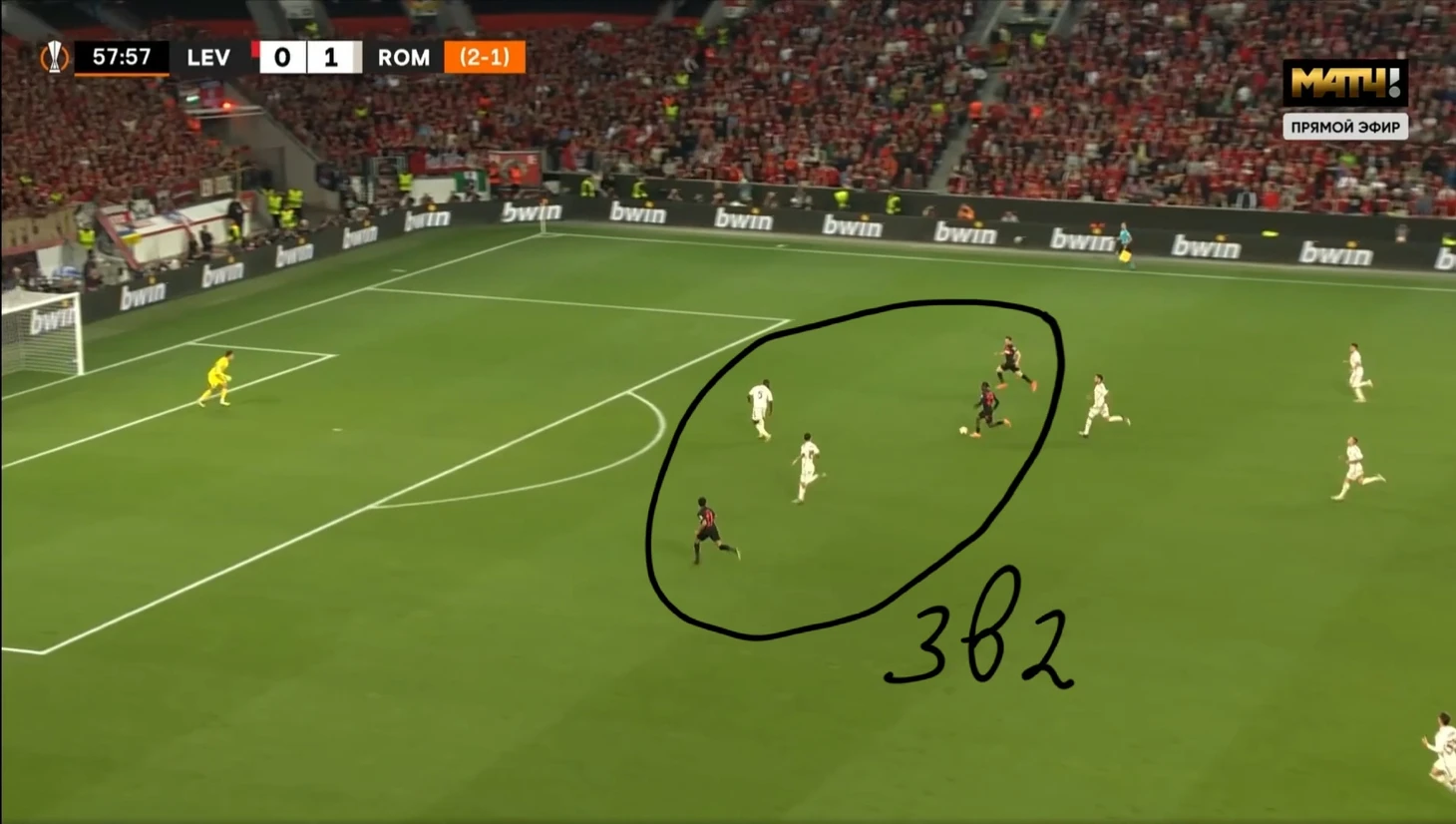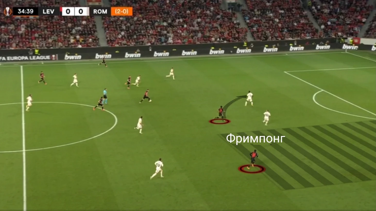 Вот ещё один пример. «Рома» снова прижимает «Байер» к своим воротам. Численное преимущество 4 в 3, и Джака, которого плотно не закрывают, обыгрался с опустившемся Адли и Та, который с помощью передачи на Инкапье вывел команду из-под давления. Фримпонг, открывшийся на правом фланге, подхватил передачу и устремился к воротам соперника. Но его удар заблокировали.