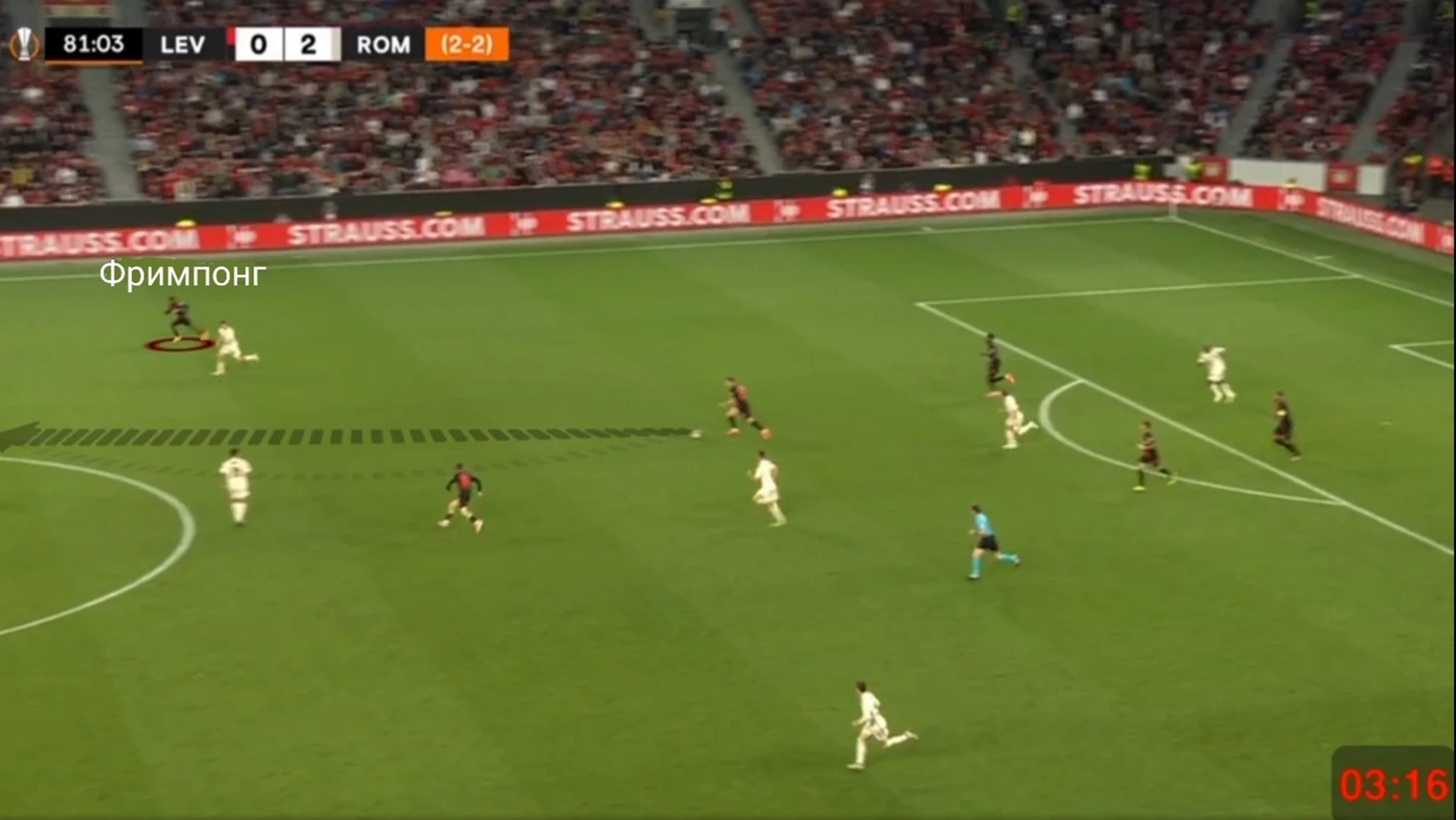 Аналогичная ситуация, но уже во втором тайме. Снова давление «Байера» на «Рому». Анхелиньо снова находится без опеки. Защитник решает сыграть через него. Идёт передача, и Фримпонг уже тут как тут. Анхелиньо в полной растерянности, а «Байер» возвращает себя мяч, зарабатывая аут.