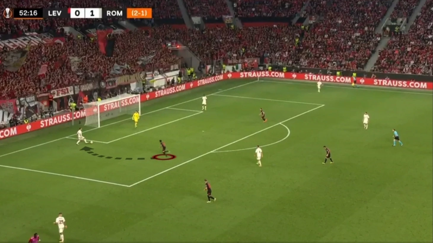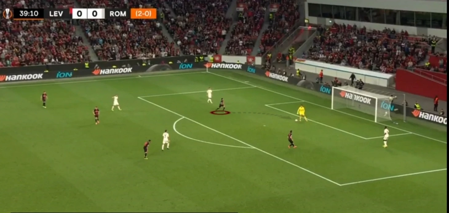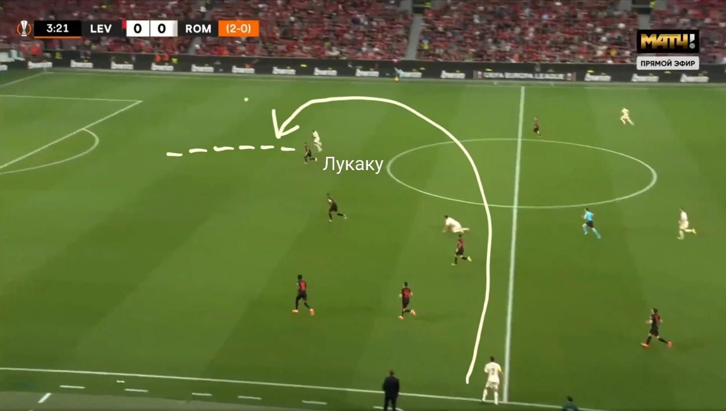 В эту зону врывается Пеллегрини и сразу же запускает Лукаку навесом в свободную зону, которую на правом фланге оставил Гримальдо. Нападающий «Ромы» остаётся один на один с Инкапье. Момент заканчивается опасным выходом Лукаку на ворота Коваржа, но вратарь «Байера» спас свою команду из-за того, что Лукаку слишком далеко отпустил мяч.