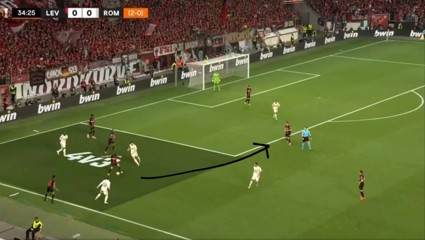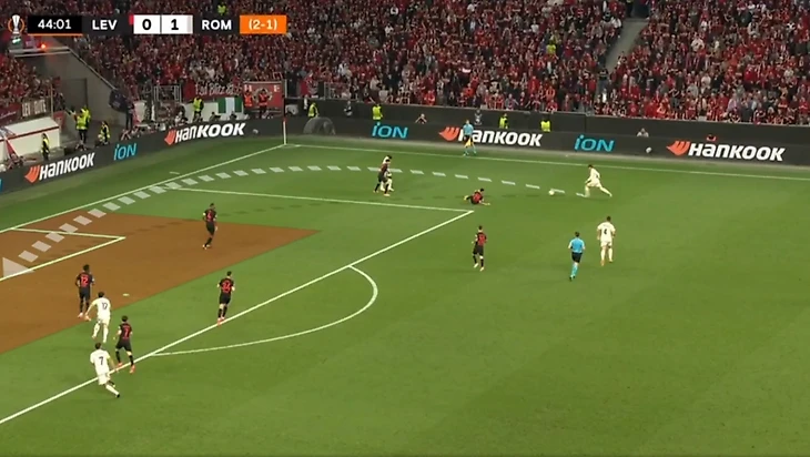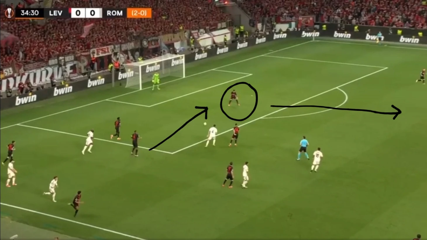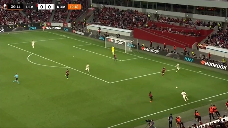 В эту зону врывается Пеллегрини и сразу же запускает Лукаку навесом в свободную зону, которую на правом фланге оставил Гримальдо. Нападающий «Ромы» остаётся один на один с Инкапье. Момент заканчивается опасным выходом Лукаку на ворота Коваржа, но вратарь «Байера» спас свою команду из-за того, что Лукаку слишком далеко отпустил мяч.