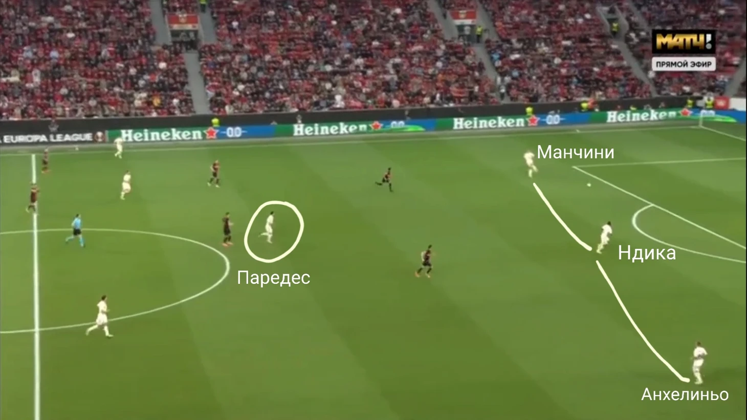 2) «Рома» стала играть в три защитника (Ндика в центра, а Анхелиньо и Манчини по краям), которым помогал опорник Паредес. Такая конфигурация наблюдалась на протяжении не только всего первого тайма, но всего матча. Такой ход помогал задействовать больше игроков в центре поля, чтобы минимизировать потери мяча и более эффективно владеть им.