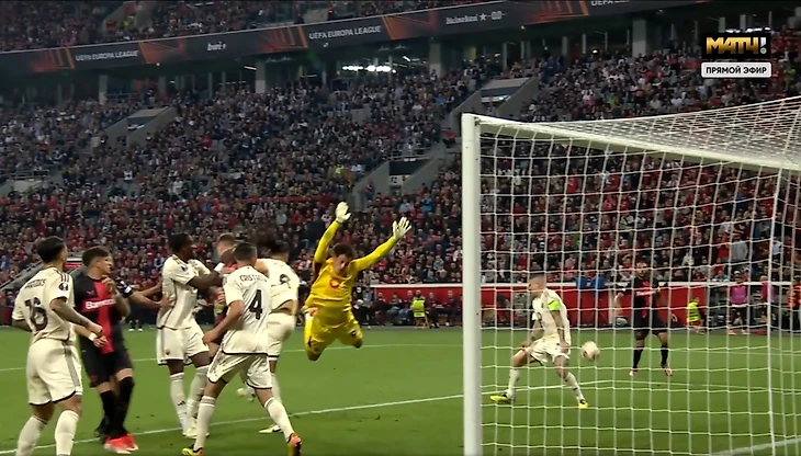 Когда на поле вышел на замену Флориан Виртц, Алехандро Гримальдо на 83-й минуте подал угловой - и мяч залетел в сетку от Манчини! «Байер» получил надежду, отыграв один мяч.