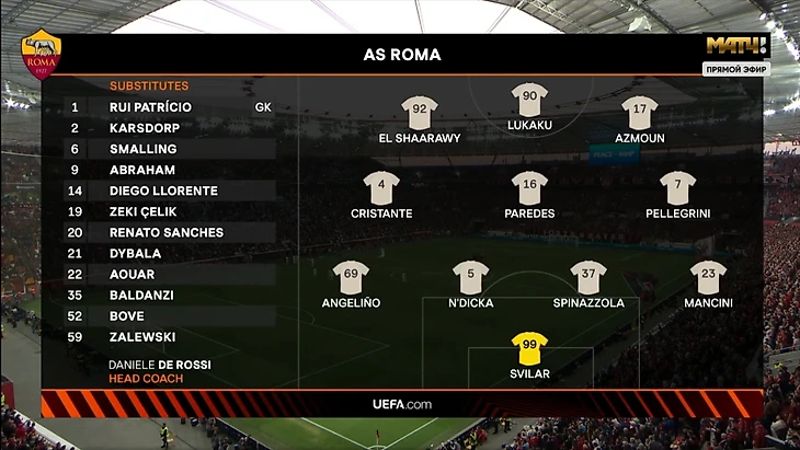 Даниэле де Росси также внёс ряд изменений в стартовый состав. В защите вместо Карсдорпа и Смоллинга вышли Анхелиньо и Ндика. В полузащите осталось то же трио, что и в первом матче - Кристанте, Паредес и Пеллегрини. Только теперь, чтобы сделать центр поля более устойчивым и перехватить инициативу в этой зоне, к этой тройке присоединялись Спинаццола и Эль-Шаарави по флангам. В нападении вместо Дибалы появился Азмун. Они с Лукаку и составили атаку «Ромы».