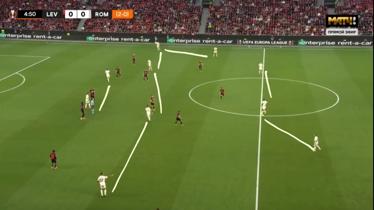 У «Ромы» просто больше не было никаких вариантов для выхода из-под прессинга, кроме выбивания мяча вперёд. Через короткий пас было очень сложно преодолеть давление. В первом тайме «Рома» 55 раз теряла владения из-за этого. «Байер» почти всегда заканчивал отбор ударом по воротам итальянской команды.