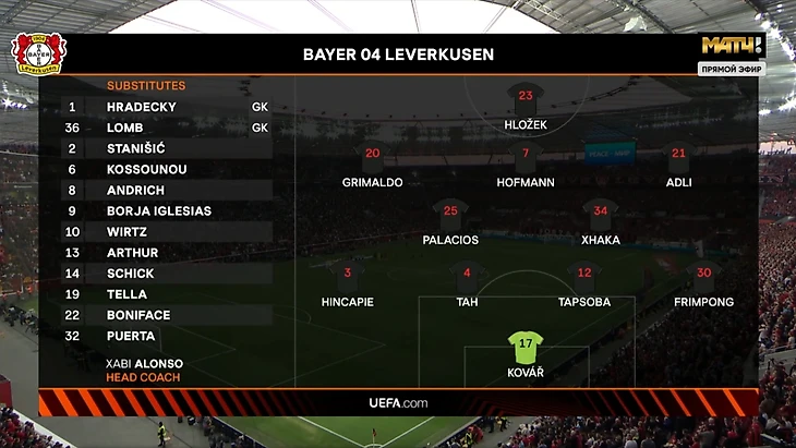 По сравнению с победой над «Айнтрахтом» во Франкфурте со счетом 5:1 Хаби Алонсо поменял стартовый состав на шести позициях, включая по традиции замену Лукаша Градецкого на Матея Коваржа в воротах. Только представьте себе, какая великолепная атмосфера царит в команде. Тренер «Байера» не любит называть Коваржа запасным вратарём и предпочитает просто вратарь 1Б. Защита: Та, Тапсоба и Инкапье, полузащита: Фримпонг, Джака, Паласиос, Гримальдо. Нападение: Хофманн, Гложек и Адли.