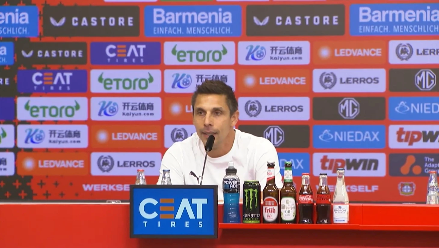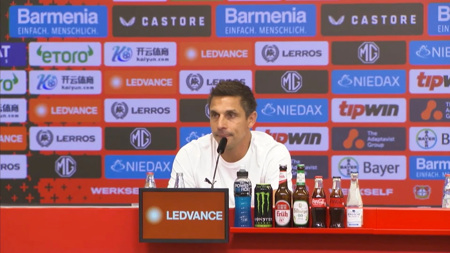 «Всем добрый вечер! Я, конечно, очень рад, что мы смогли получить хороший результат. Я прекрасно понимаю и считаю это совершенно нормальным, когда твоей команде приходиться много страдать и защищаться, а также требуется немного удачи в матчах против очень сложных соперников. Именно таким нам представлялся «Байер», когда мы отправлялись в Леверкузен. У нас было всё это сегодня, и тем не менее, я должен сказать большой комплимент своей команде, потому что после неудачного старта, мы смогли собраться, у нас появились шансы, и мы их реализовали. Но в то же время я думаю, что мы бы могли предотвратить эти два пропущенных мяча, если бы лучше оборонялись. Это наша ответственность».