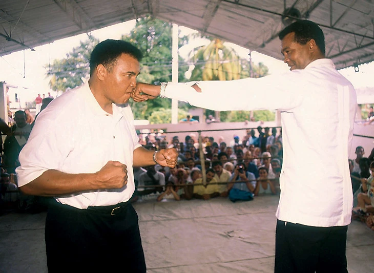 Али приехал на Кубу в 1996м с гуманитарной миссией, уже порядком разбитый болезнью, но все равно в спаррингах с местными боксерами был слишком быстр, как и для советских боксеров в Москве, за 18 лет до этого. На глазах Фиделя он шутливо обменивался ударами по воздуху со Стивенсоном, показал пару фокусов и уехал, подарив «Команданте» на память свой резиновый палец.