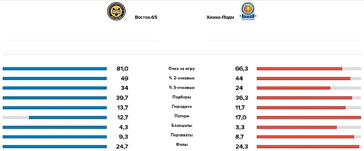 По результативности в составе «Восток-65» четыре игрока набирают более 10 очков в среднем за матч. Это Даниил Соловьёв (12.7), Алексей Голяхов (12.3), Илья Сыроватко (12.3) и Даниил Аксёнов. В составе «Химки-Подмосковье» таких игроков трое: Игорь Вольхин (14), Иван Евстигнеев (11) и Эльхан Ахмедов (10.3).
