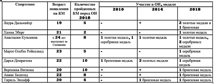 Постоянная накатка на КМ только нынче, в этом году, в возрасте 24 года. Дальмайер в этом возрасте уже взяла Большой хрустальный глобус, но Лауру на КМ запустили в 19 лет. Одногодка Васнецовой - Давидова уже второй сезон 11-я в общем зачёте, и на взрослом уровне выступает с 20 лет,. Маркета уже в 21 год выступала на олимпиаде в Пхенчхане , - смотрим об этом тут