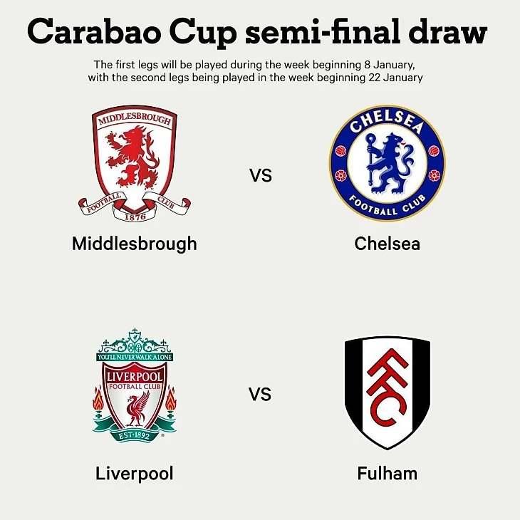 Итак, в 1/2 Кубка Лиги сыграем против «Мидлсбро». Со следующего сезона полуфиналы КЛ будут проходить в один матч, как было в ковидный год и в то время, когда турнир только придумали. В этом сезоне пока по старинке, в два матча. Первый играем на выезде (на «Риверсайде»), второй – дома. В параллельном полуфинале сыграют «Ливерпуль» и «Фулхэм».