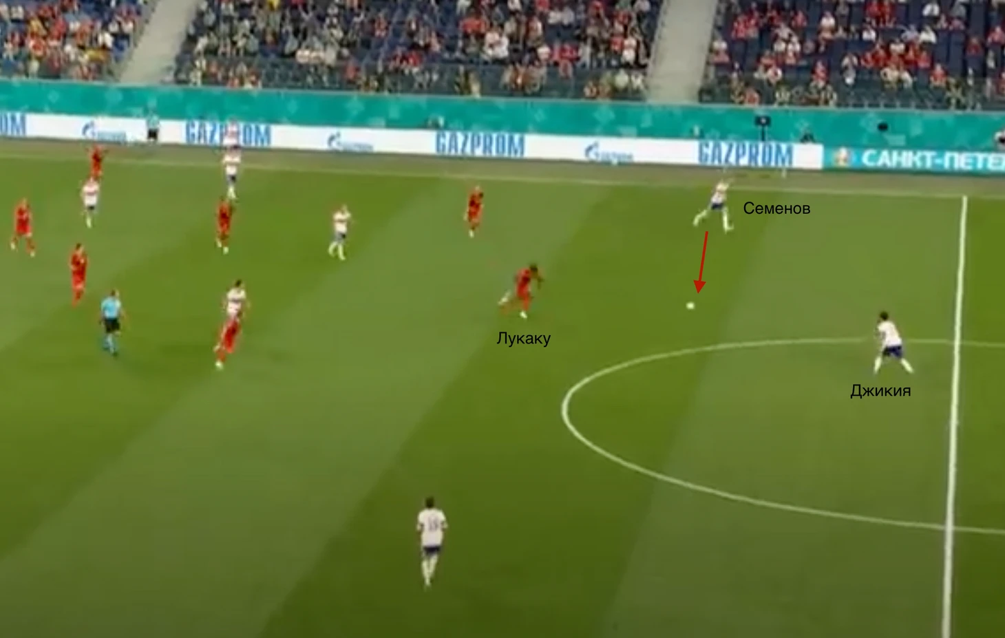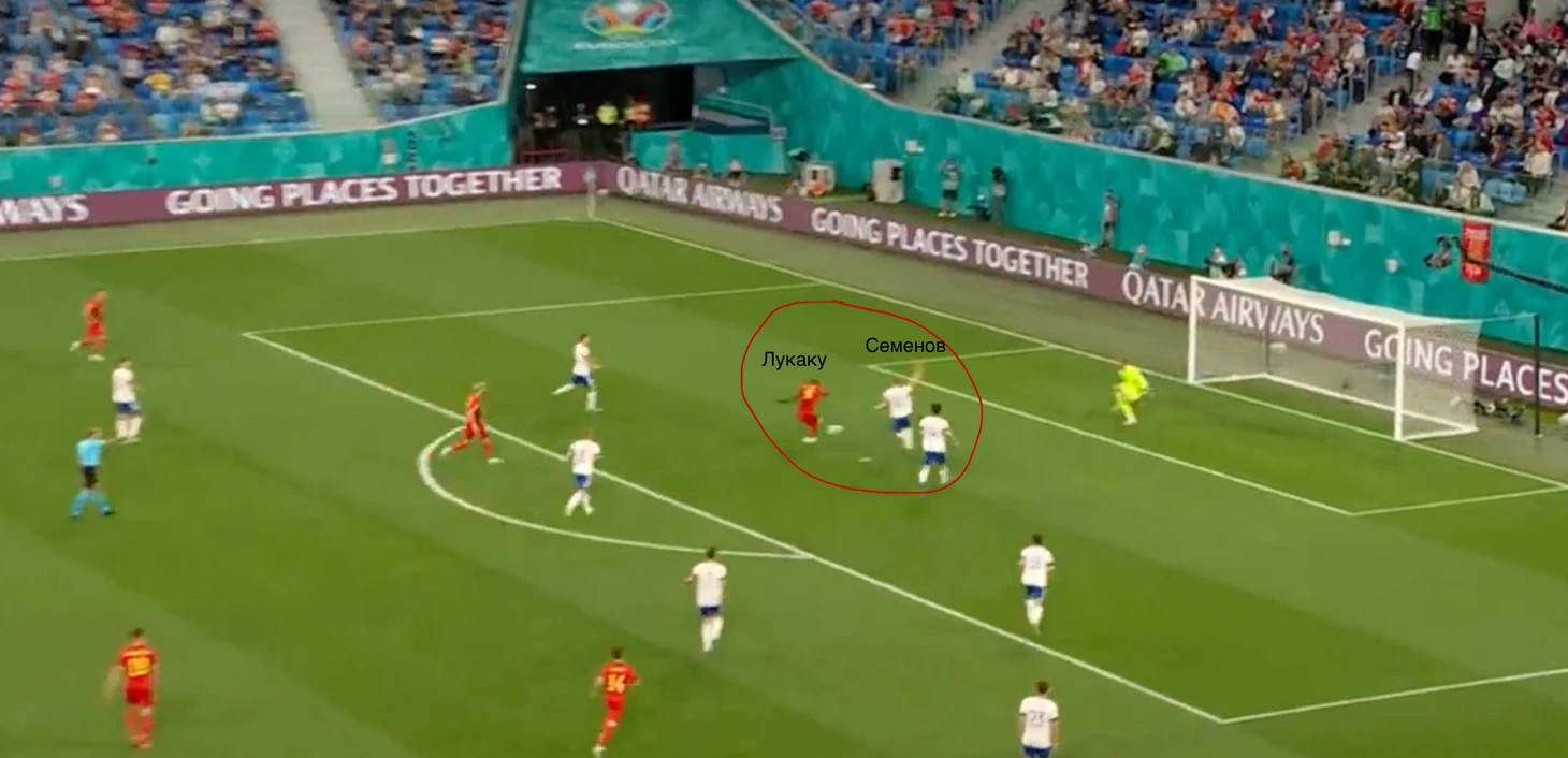 Момент 1. 0:1. Первый раз мы ошиблись на 10 минуте. Грамотно сделали искусственный офсайд, но технически не смогли нивелировать угрозу. Мяч предательски попал неуклюжему Семенову и последовал к Лукаку. Офсайда уже нет, быстрая обработка мяча, удар, гол. Совершивший ошибку, Семенов даже не пытается исправить ситуацию, вместо того чтобы бежать к Лукаку, стелиться в подкат и пытаться заблокировать удар, Семенов, подбежав к Ромелу, поднимает руку и никак не мешает нападающему пробить.