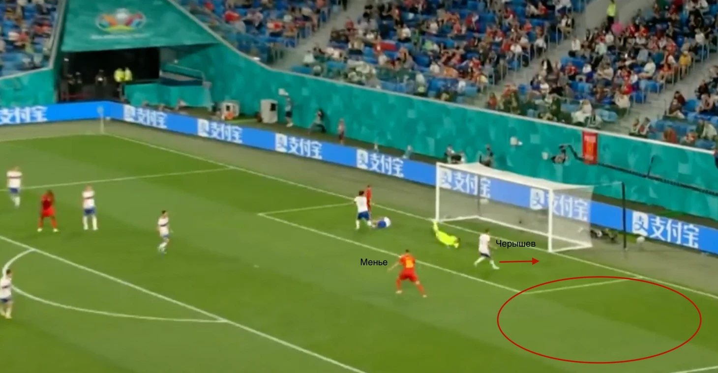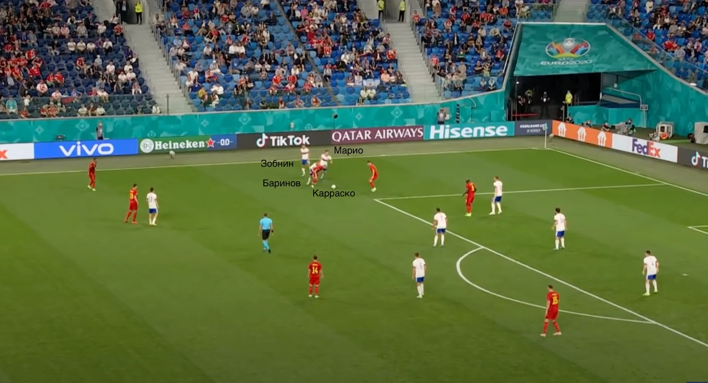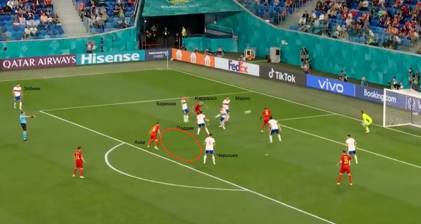 Дальше без сопротивления входит в штрафную и целых 5 секунд улучшает позицию и ищет момент для удара. Из эпизода не выключились двое, Марио и Баринов, Зобнин же никак не пытается помочь обороне. Да, когда Карраско вошел в штрафную, то скорее всего искал контакта для пенальти, не дождавшись его, был вынужден наносить удар. Но если бы полезащитник бельгийцев искал момент для передачи, то для этого отличным вариантом являлся Торган Азар, про которого снова забыли футболисты сборной России. Оздоев зачем-то включился в группу игроков, наблюдающих за действиями Карраско из «первого ряда», а Черышев снова выключился из эпизода и смотрел футбол.
