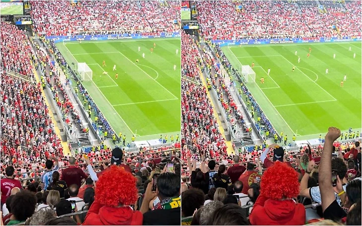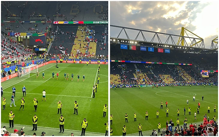 Ближе к концовке стали выбегать некоторые зрители на поле (все поклонники Турции) и бежали именно к Криштиану Роналду ради фотографии. Я насчитал суммарно шесть таких: три во время матча и три после свистка. Первым был ребенок – он быстро добежал, успел сделать фото и так же быстро убежал от стюардов обратно, те его настигли только возле трибун. Его успех стадион воспринял овациями и активной поддержкой. Но когда стали выбегать взрослые мужчины, прерывая ход игры, то это сильно раздражало не только всех присутствующих зрителей, но и самого Роналду, который не желал с ними позировать и отмахивался.