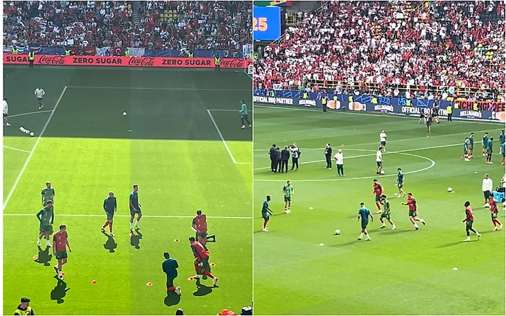 Затем вышли игроки на разминку. Особый прием для Криштиану устроили турецкие болельщики. Любой его показ на экране, выход на поле и объявление диктора сопровождались диким гулом и освистыванием. Я же не упустил возможность подобраться поближе к португальской стороне, чтобы запечатлеть мировую звезду.