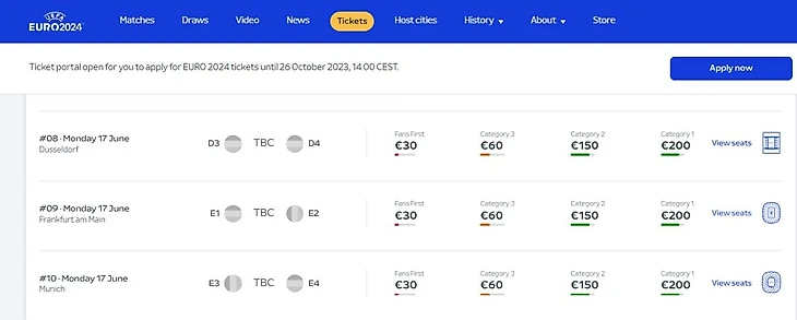 Стал изучать в интернете информацию как купить билет. Как раз начинался первый этап продажи билетов: надо было зарегистрироваться на сайте uefa, выбрать день и место проведения матча, категорию билета и подать заявку на возможность приобретения. Тогда еще не закончился отборочный раунд и поэтому группы были неизвестны, от того и цена была невысокой: самая дешевая категория Fans First (для активных фанатов за воротами) стоила 30€, Category 3 (места на верхнем ярусе) – 60€. Чем выше категория, тем ниже спрос. Я стал выбирать удобные по логистике матчи, в приоритете был стадион «Боруссии» Сигнал Идуна Парк и собирался что-нибудь поблизости захватить. Стадионы из Кельна, Дюссельдорфа, Гельзенкирхена и Дортмунда находятся в удобной близости друг от друга. В итоге я подал заявку на несколько матчей: один матч в Дортмунде за 60€ и нескольких других матчей за 30€.