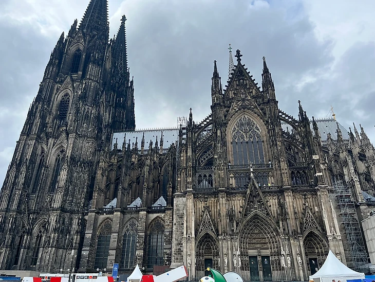 По прилету в Кельн мы доехали до ж/д вокзала, прямо возле которого расположен величественный Кельнский собор. Это 157-метровый римско-католический готический собор, заложенный еще в 1248 году и являющийся одним из самых высоких в мире. Во время Второй мировой войны Кельн был практически весь уничтожен, чудом не пострадал только собор. Считается, его сохранили как важный географический ориентир.