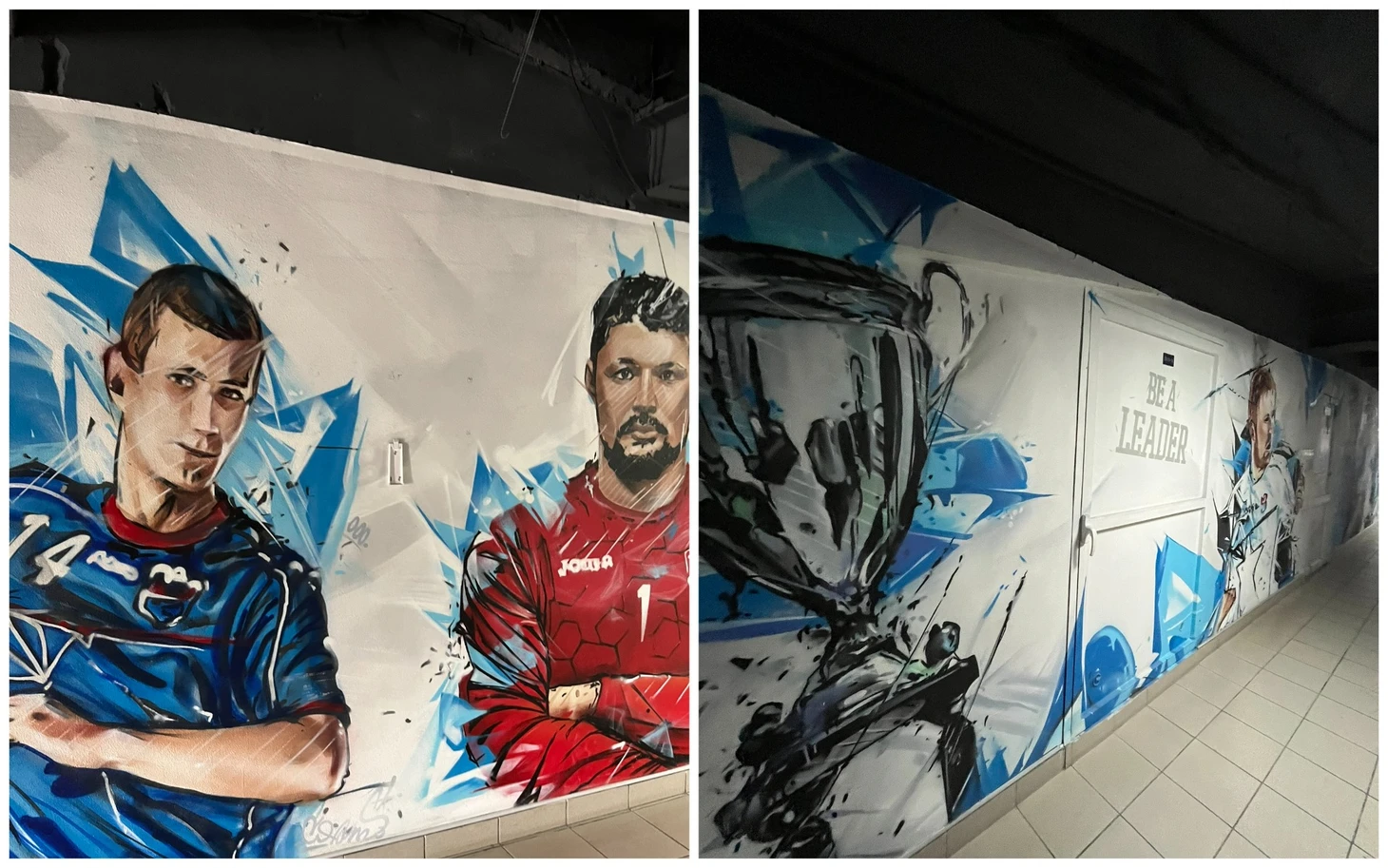 Спускаемся вниз в подтрибунное помещение. Стены коридора, ведущие к раздевалкам и к выходу на арену, украшены в граффити местных легенд – местный воспитанник Андрей Юринок (в команде с 2016), хорватский вратарь Иван Пешич (выступал в течение 2013-2021 годов) и капитан команды Вячеслав Шумак (сыграл более 550 матчей за БГК и забросил 1100 мячей).