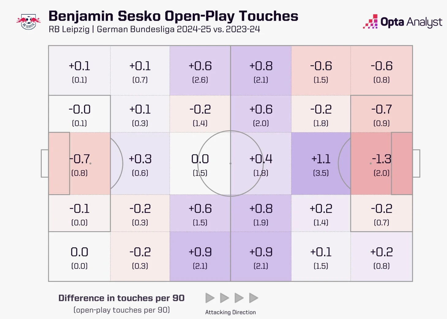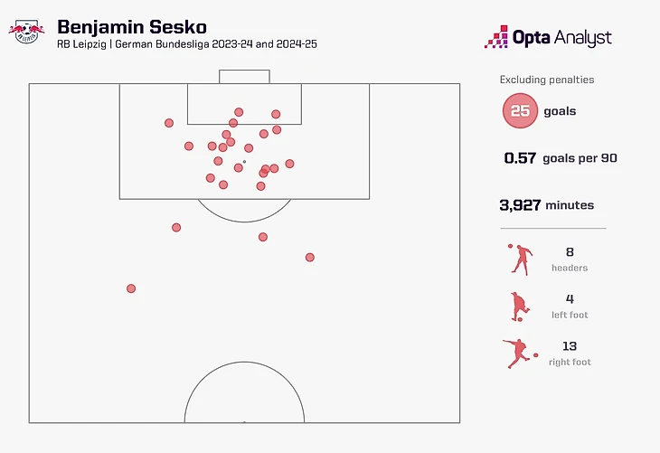 В первом сезоне за «Лейпциг» он казался чистым завершителем. Играл близко к воротам, 13 из 14 голов в Бундеслиге — из штрафной. 0.82 гола за 90 минут — третий показатель в чемпионате после Кейна и Гирасси. Всё выглядело логично: огромный, быстрый, бьёт с обеих ног и головой.