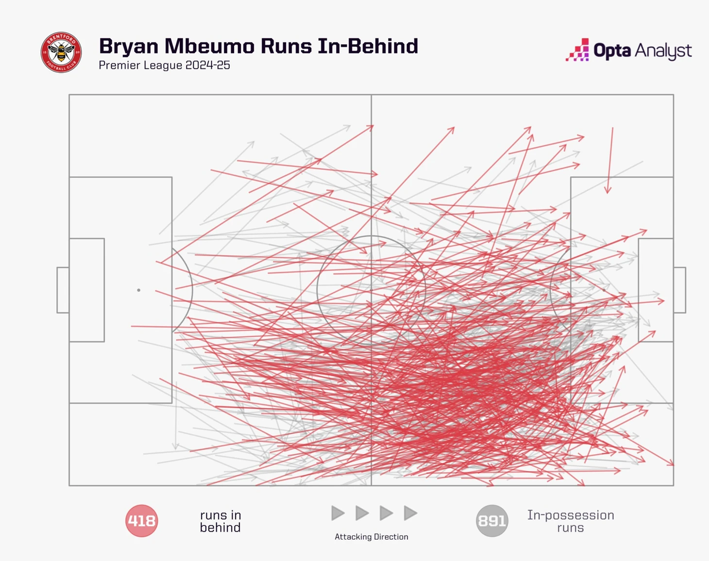 Его движение вне мяча — мощный актив. Он сам создаёт себе моменты, а если рядом будут партнёры с интеллектом и таймингом (вроде Мбеумо, которого уже подписал Юнайтед), — он получит больше точек для рывка. Мбеумо, кстати, был лидером АПЛ по числу забеганий за спину при владении. Отличный тандем для форварда, который любит открываться, но не всегда получает мяч.