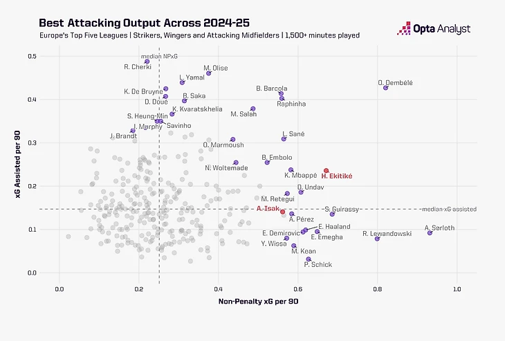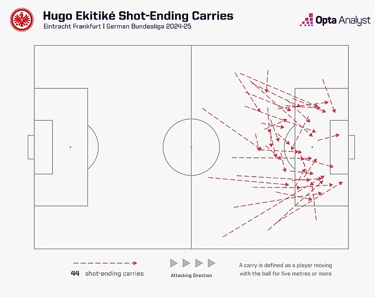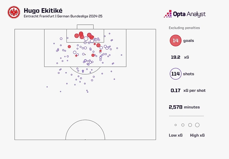 В Бундеслиге-2024/25 Экитике стал одним из самых опасных игроков Европы. Он — один из четырёх, кто провёл более 1500 минут и при этом набирал 4+ ударов и 7+ касаний в штрафной за 90 минут. Компания соответствующая: Мбаппе, Дембеле, Ламин Ямаль и тд.