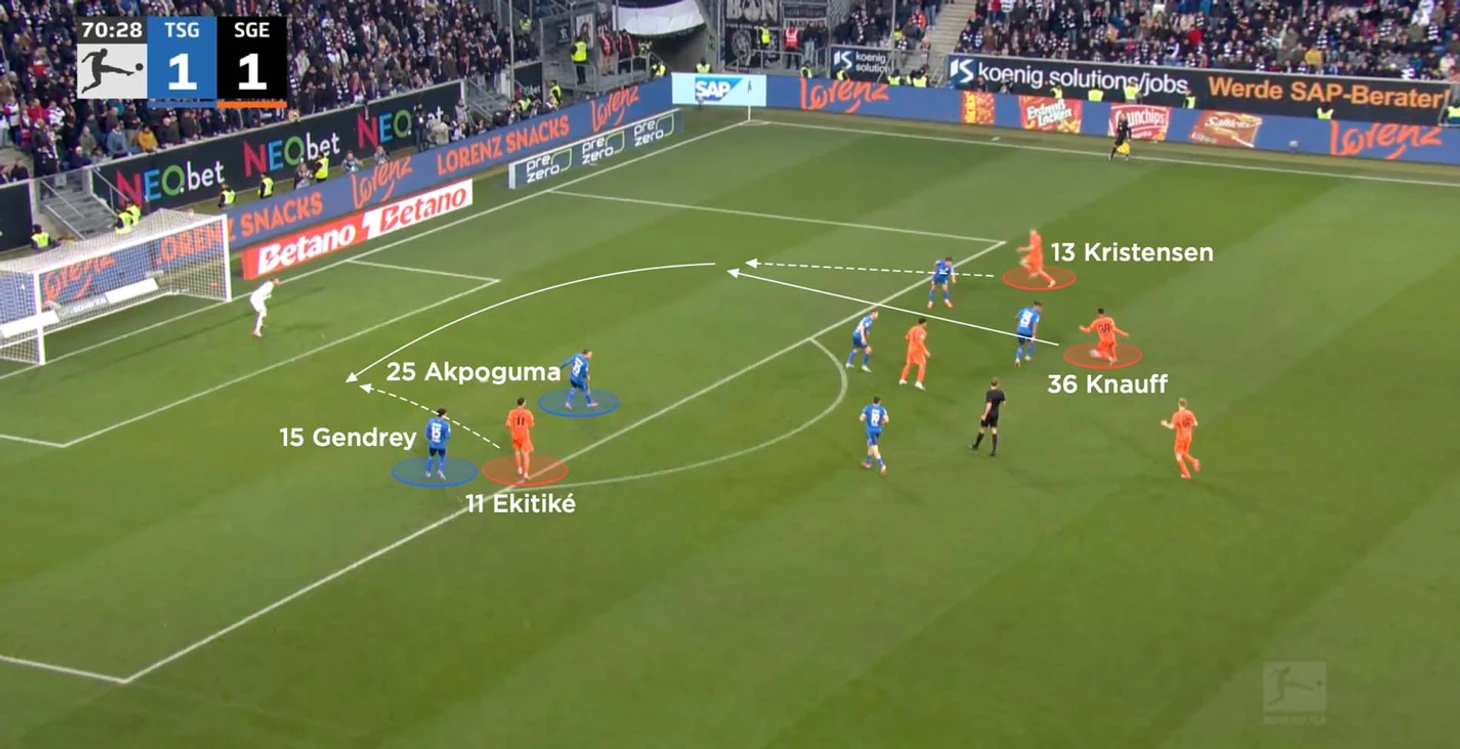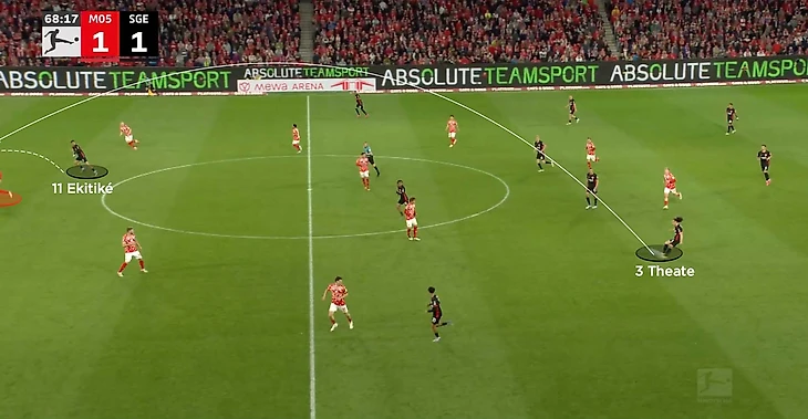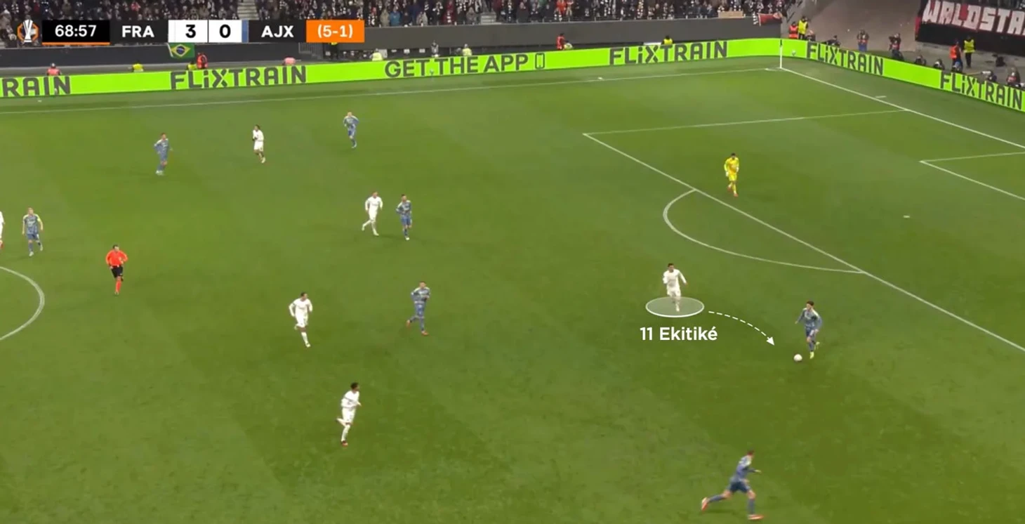 Не стоит думать, что он пассивен. Несмотря на то, что Айнтрахт не был ярко прессингующей командой, Экитике выделялся на фоне партнёров. 15.3 высокоинтенсивных прессинга за матч — №1 в клубе. Это сравнимо с Исаком, который лидировал по этому параметру в Ньюкасле (19.6).