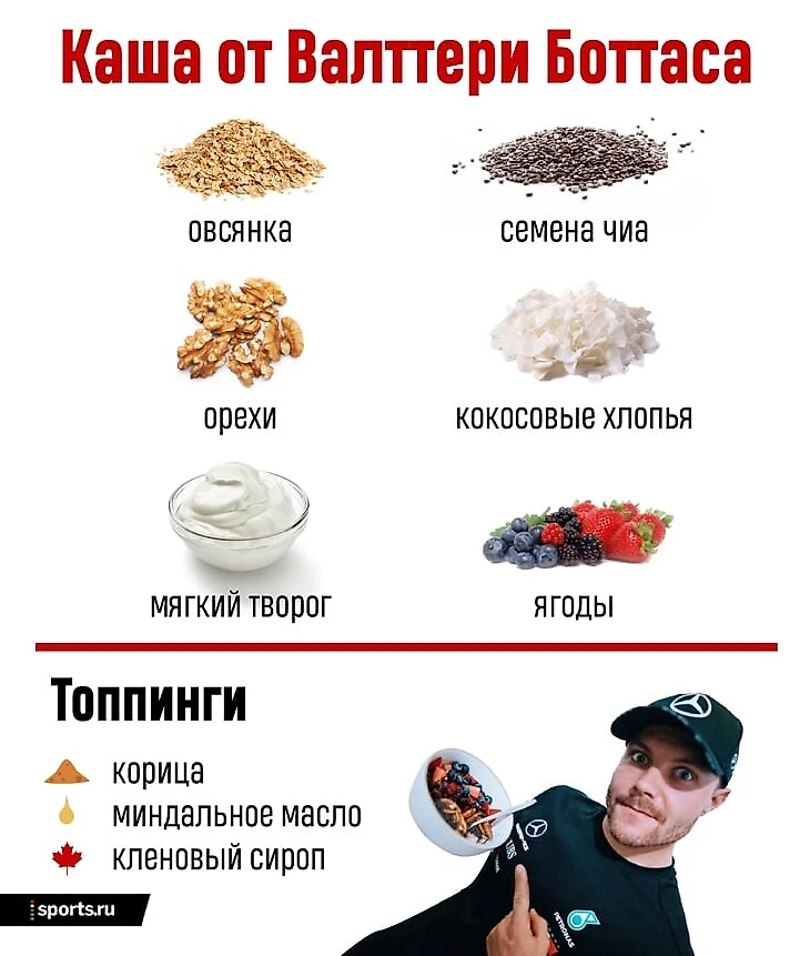 Боттас – настоящий эстет и превращает свой завтрак в произведение искусства. Соотношение овсянки и воды можно выбрать на свой вкус, главное – не переварить. Семена чиа Боттас добавляет еще в процессе варки – «для текстуры», а готовый продукт украшает кокосовыми хлопьями, мягким творогом, ягодами, грецкими орехами и миндальным маслом. В качестве дополнительных топпингов – кленовый сироп и очень много корицы. Похоже, у известного повара (и по совместительству пилота «Хааса») Ромена Грожана появился конкурент.