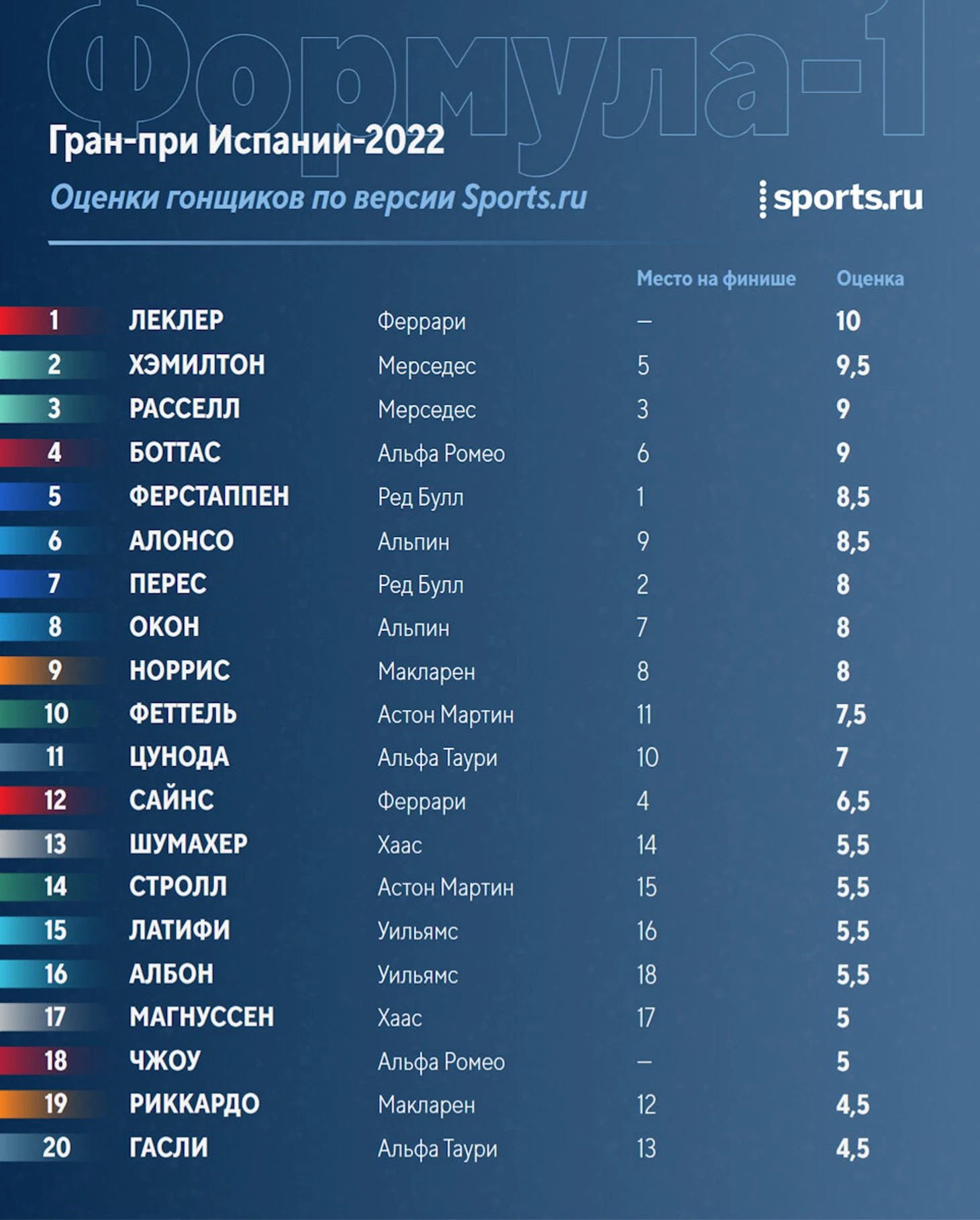 В новом рейтинге Sports.ru представлены оценки за выступления пилотов «Формулы-1» по десятибалльной шкале. Главные факторы – работа в гонке, усилия пилота при выполнении личных и командных задач и сравнение с напарником; квалификации тоже учитываются, но как второстепенный показатель. Собственные ошибки влияют на оценку, технические неполадки – нет. При равенстве баллов первым указывается гонщик, финишировавший выше.