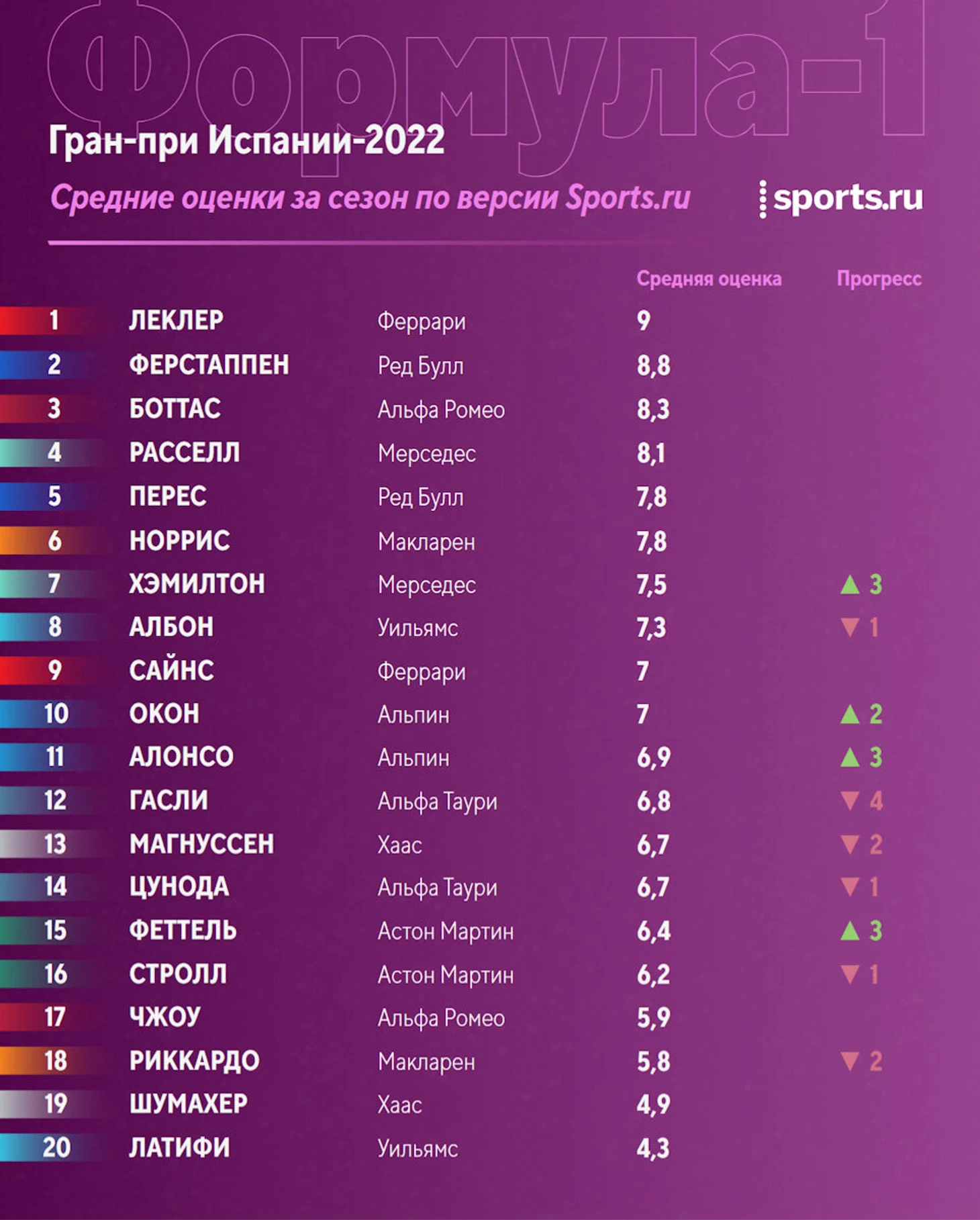 Леклер захватил единоличное лидерство в рейтинге Sports.ru за сезон – хоть какое-то утешение после потери 50 очков преимущества над Ферстаппеном за три последние гонки. Боттас тем временем стал чуть ближе к топ-2.