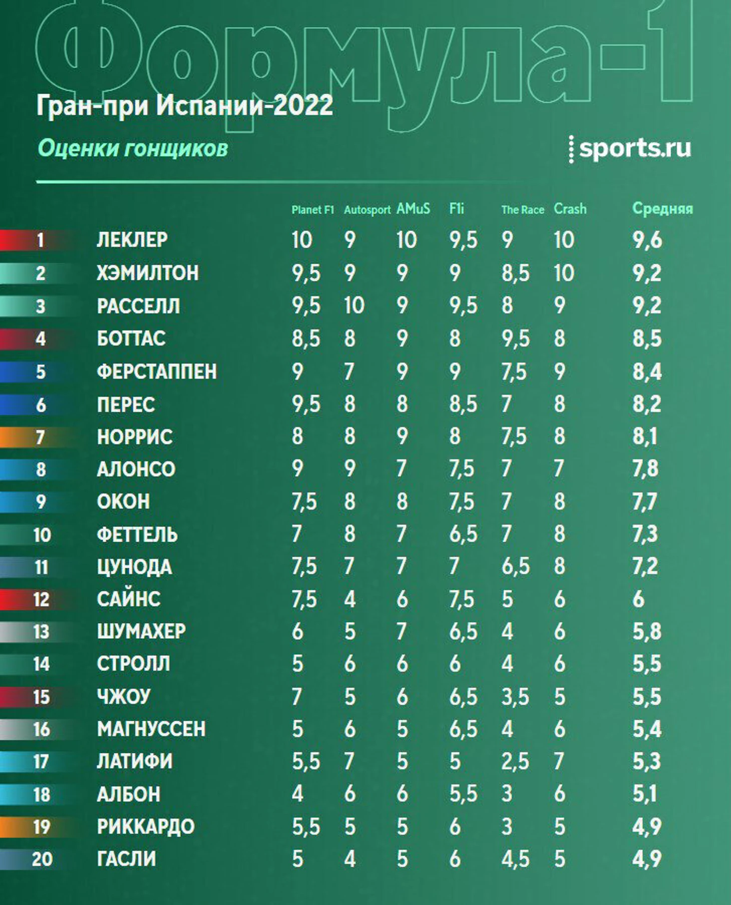 Леклер покорил экспертов европейских изданий, у Хэмилтона с Расселлом в активе по одной «десятке». Оценки нового лидера «Ф-1» разделились – в результате Ферстаппен уступил по среднему баллу Боттасу, но опередил Переса.