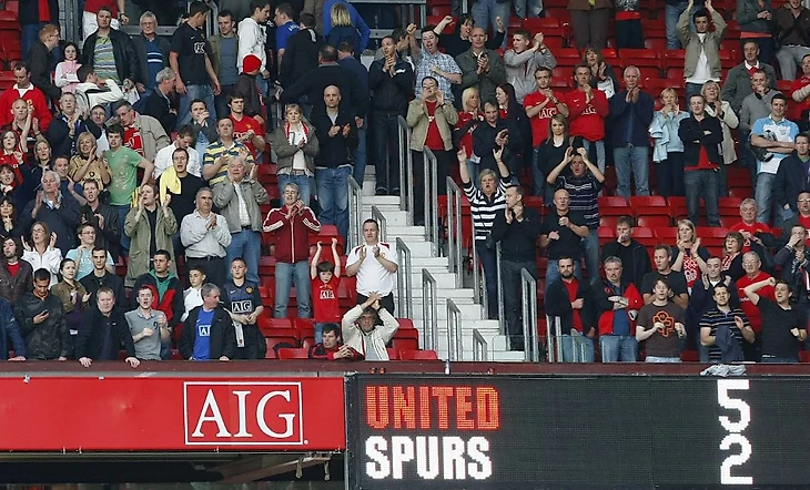 В этом чемпионском для Юнайтед сезоне гости из северного Лондона приехали в Театр мечты с Модричем и Бейлом в составе. Они успели дважды до перерыва огорчить «красных». Никто доподлинно не знает, что Фергюсон говорил в раздевалке, насколько горячо дул «фен». Но во втором тайме в ворота Эурелио Гомеса влетело пять безответных мячей. По дублю отличились Руни и Роналду. Еще один гол на счету Димитара Бербатова.