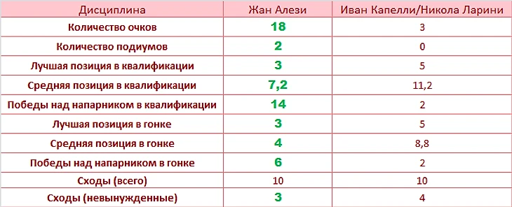 Жан, когда доезжал до финиша, практически не уступал гонщикам из нижней (относительно него) части таблицы и трижды смог опередить болиды топ-6. Мика не всегда был стабилен, но у него почти в два раза больше завершенных гонок, что влияет на показатели.