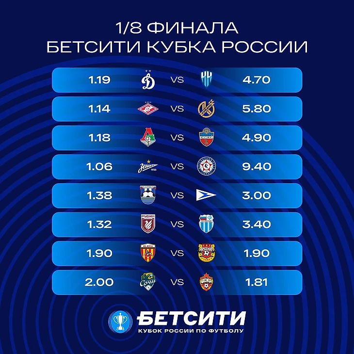 Напоминаем полный список пар 1/8 финала БЕТСИТИ Кубка России: