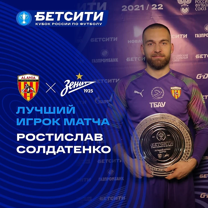 Ростислав Солдатенко признан лучшим игроком матча 1/4 финала БЕТСИТИ Кубка России между «Аланией» и питерским «Зенитом».