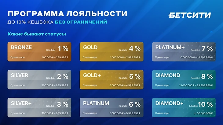 Делай ставки на сумму от 100 000 рублей в месяц, получай статус от Bronze до Diamond+ и до 10% кешбэка без ограничений по сумме выплат.
