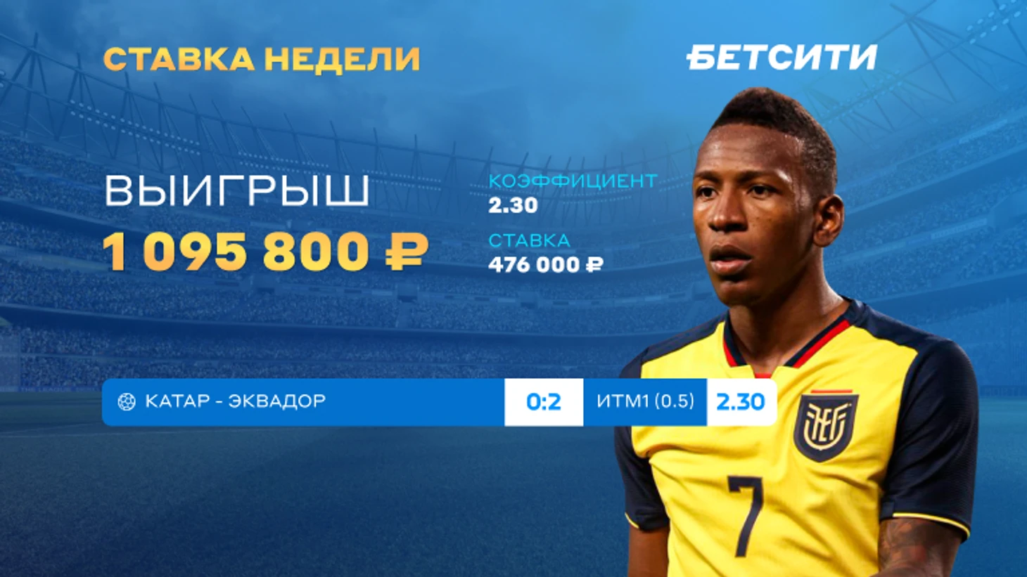 Игрок БЕТСИТИ не переживал за то, что команда-хозяйка ЧМ за 92 года ни разу не уступала в матче открытия, и загрузил почти полмиллиона на «сухую» игру Эквадора.