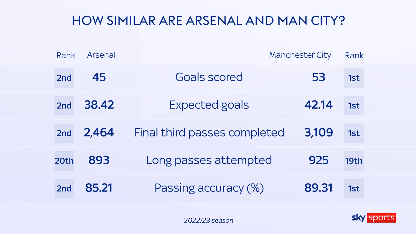 Sky Sports предлагает интересное сравнение «Арсенала» с «Ман Сити» по показателям нынешнего сезона АПЛ: