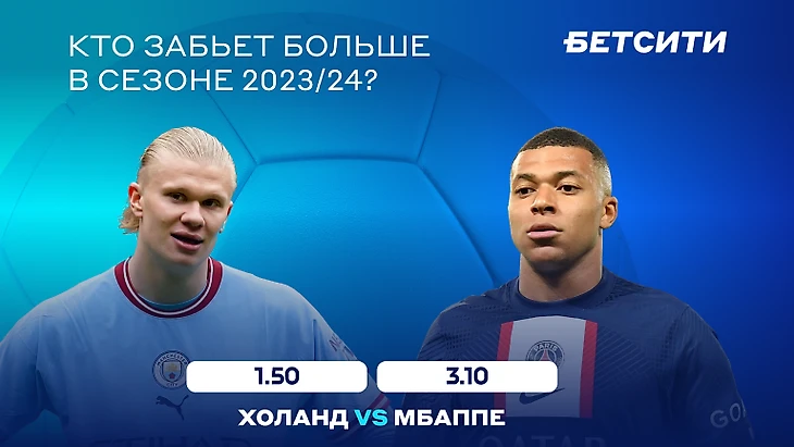 Холанд — фаворит в гонке с Мбаппе по голам. Поставить на победу Эрлинга можно за 1.50, а успех Мбаппе идет за 3.10. Вероятность равного количества голов форвардов за сезон оценивается котировкой 9.10.