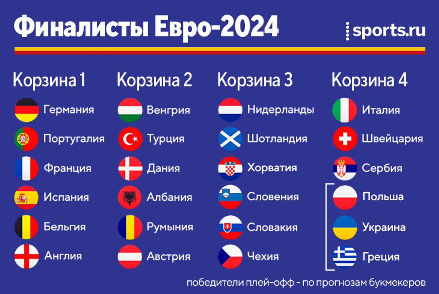 Таким образом, букмекеры прогнозируют выход на Евро Польши, Украины и Греции. В этом случае вот так выглядели бы все финалисты по корзинам: