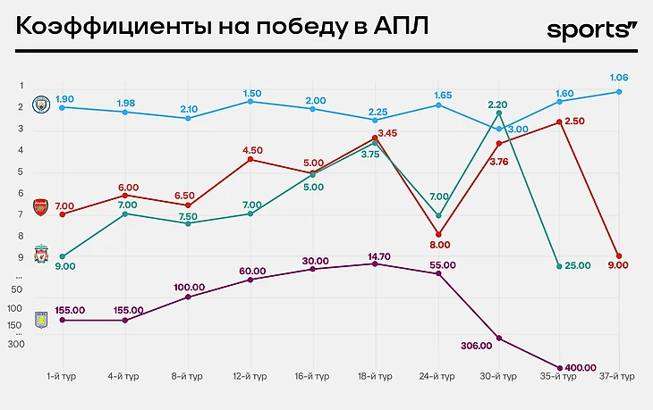 Динамика коэффициентов за сезон: «Арсенал» приближался к «Сити» и держался до последнего
